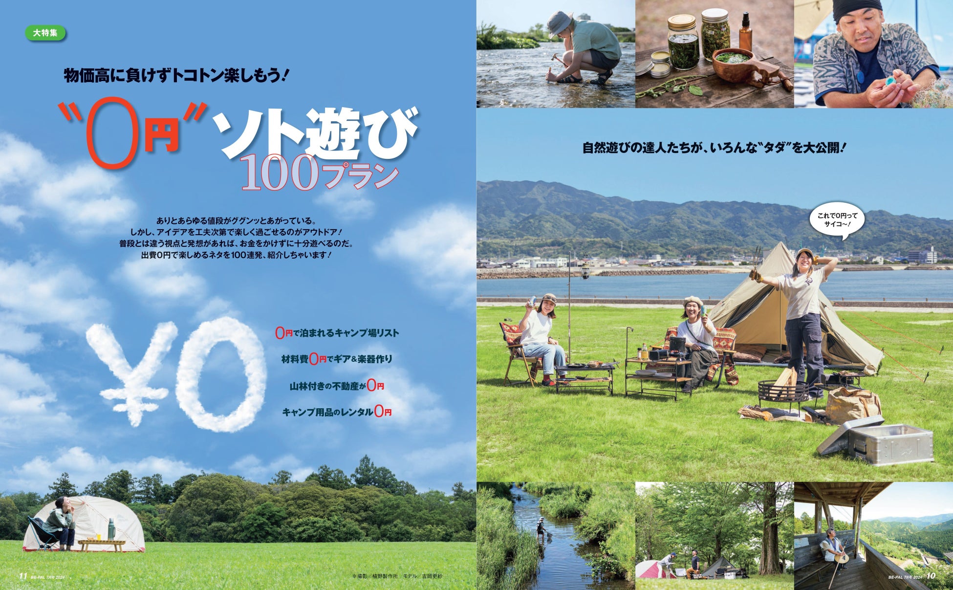 さらに、今号の大特集は「"0円"ソト遊び100プラン」。食品に電気代、いろんなものが値上がりしているけど、アウトドア好きならタダで遊び尽くそう! ということで、無料キャンプ場に無料のギアレンタル、さらに、残り野菜で菜園作り、どこでもできるレア雲観察、竹で作る0円ギアに海洋ゴミで楽器作りなどなど、100のアイデアをドドンと紹介します!