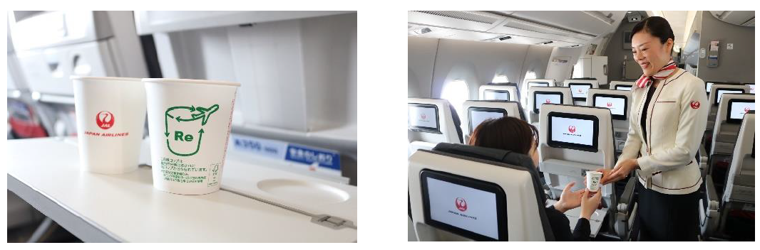 JALグループでは、日本製紙グループと共同で、2022年12月より機内サービスで使用した紙コップの分別回収とリサイクルを実施してまいりました。紙コップの回収対象路線は、東京(羽田)=沖縄(那覇)線からスタートし、現在は東京(羽田)=札幌(新千歳)・旭川・福岡・長崎・熊本・鹿児島・沖縄(那覇)線に拡大しています。(エアバスA350-900型機・ボーイング767-300ER型機運航便が対象)※