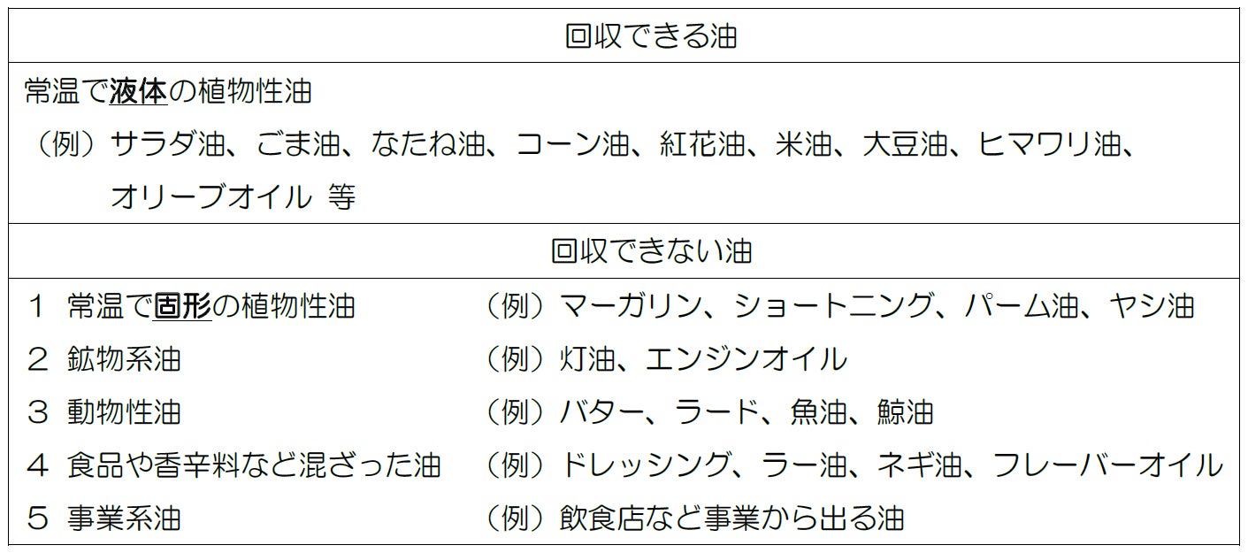 店舗で回収できる油は次のとおりです。ご確認の上、店舗にお持ちください。