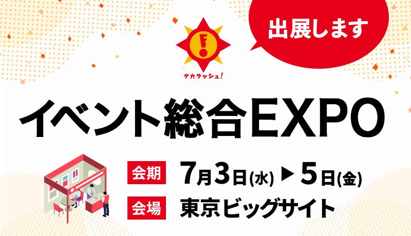 体験型コンテンツ「リアル宝探し」の企画・制作・運営を手がける株式会社タカラッシュ(本社:東京都品川区、代表取締役:齊藤 多可志、以下タカラッシュ)は、7月3日(水)~7月5日(金)に東京ビッグサイトにて開催される「第11回イベント総合EXPO」に出展することを決定いたしました。