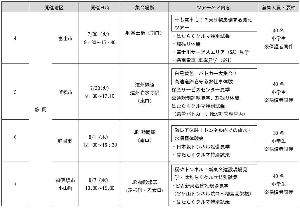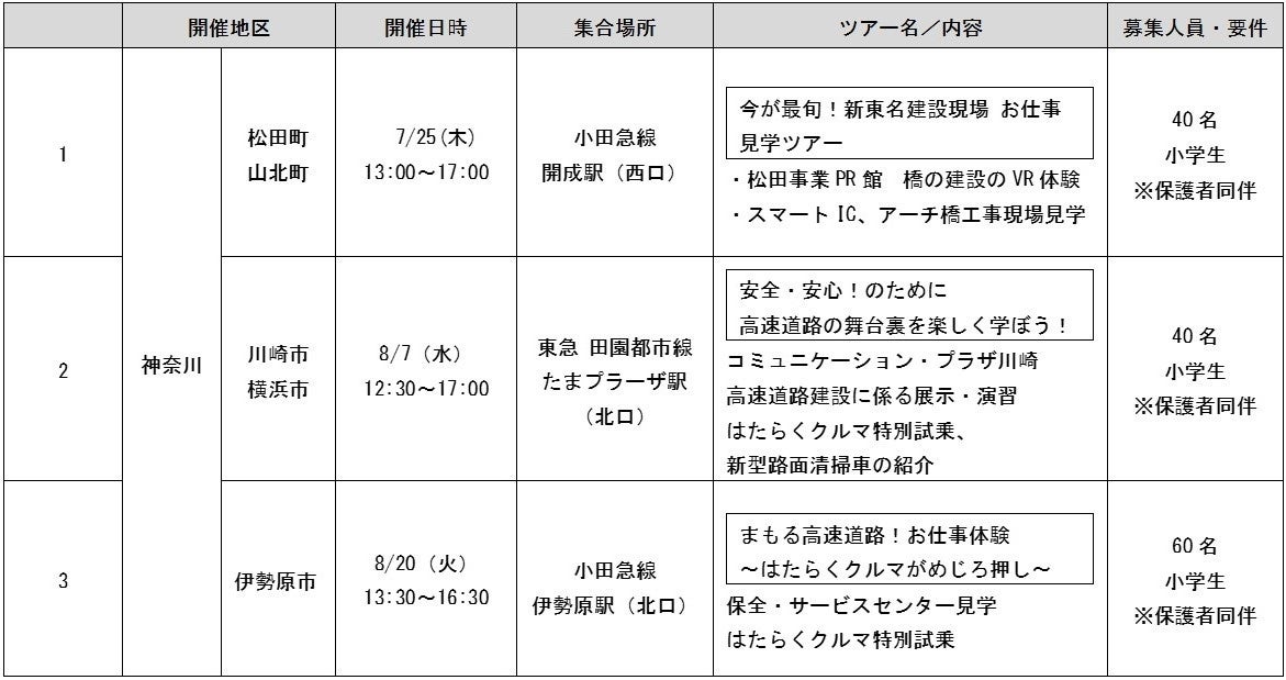 NEXCO中日本 東京支社(東京都港区、支社長・松井 保幸)は、子どもたちに高速道路を身近に感じてもらうため、小学生を対象とした夏休み高速道路見学会「ハイウェイみて!みて!ツアーズ」を、7月25日を皮切りに神奈川県と静岡県の全7地区で開催します。