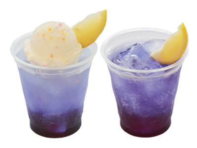 ご提供時は青紫色で、ご自身で別添えのレモネードベースを加えて混ぜると赤紫色へとカラーチェンジがお楽しみいただけます。