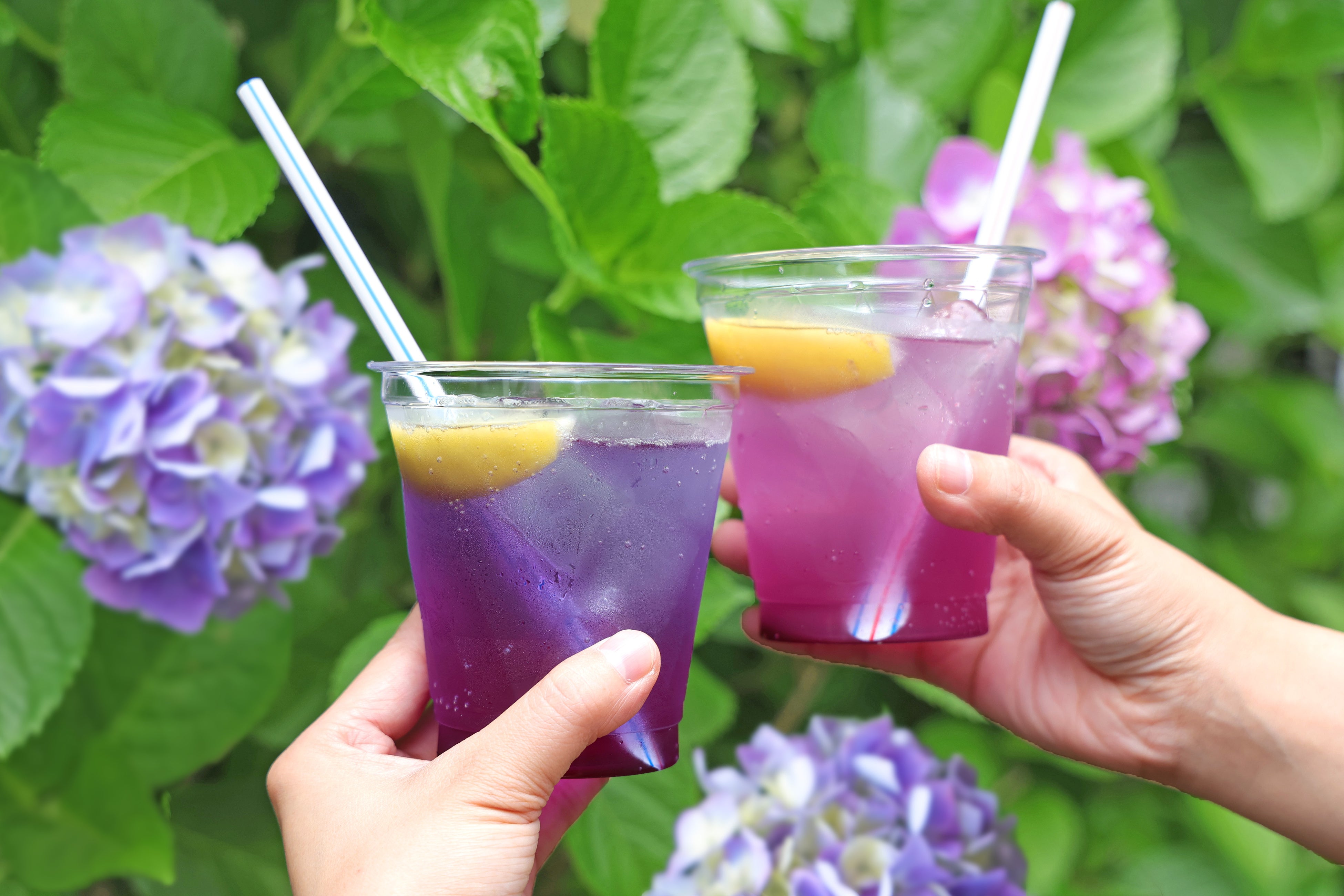 バタフライピーティーソーダの爽やかな味わいは、あじさい鑑賞を楽しんだあとにオススメの一品です。