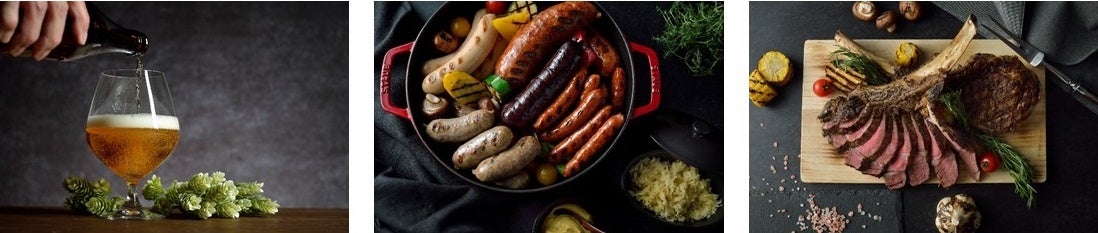 お食事にはビールにぴったりなドイツ伝統の白ソーセージやチョリソーなどをいれた5種類のソーセージ、ビーフトマホーク、ラムショルダーホットケイジャン、ひな鳥の丸焼きなど、スパイスやハーブを効かせたお肉料理を多数ご用意しています。