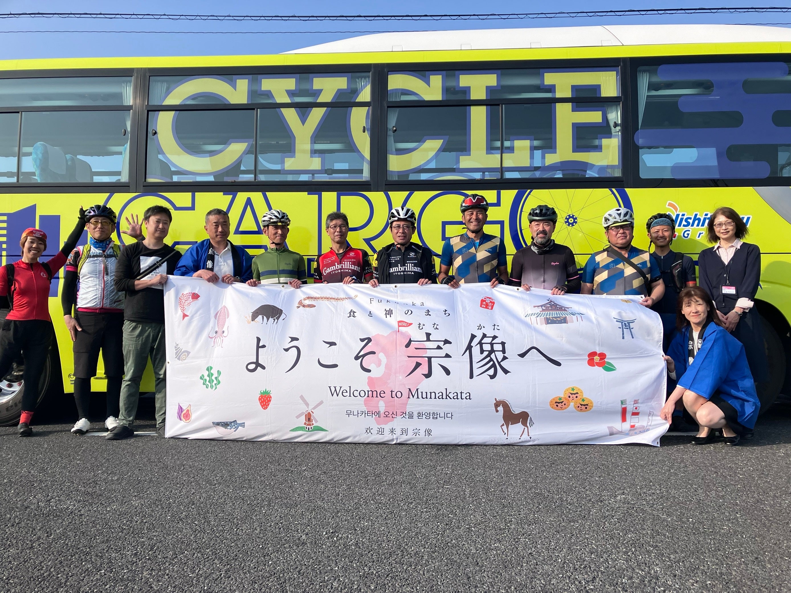 ・ゴール地点でサイクルバス「西鉄CYCLE CARGO」も合流。バスをバックにみんなで記念撮影