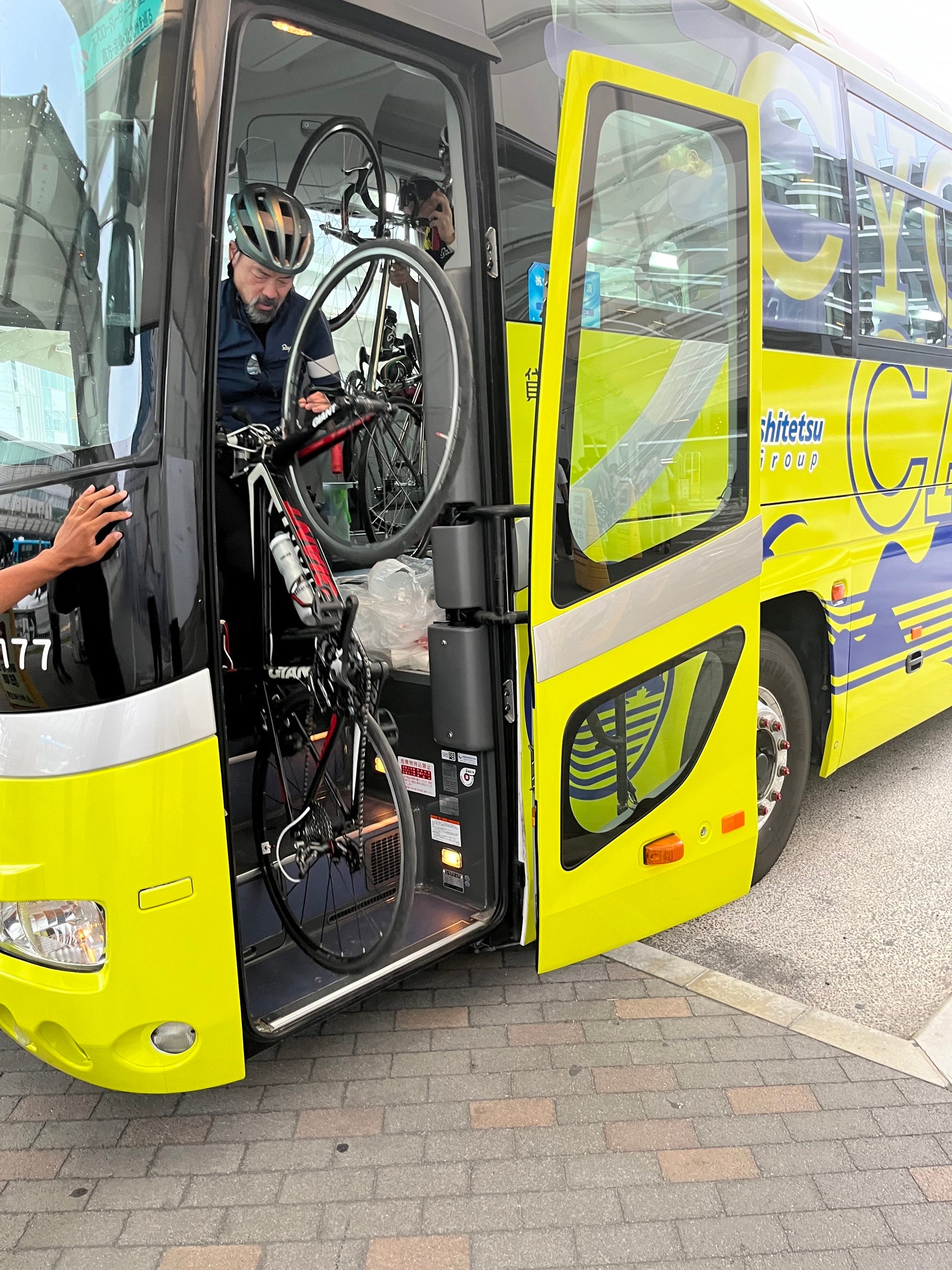 ・記念撮影後は自転車を「西鉄CYCLE CARGO」に載せ込み。分解せずに載せ込めるので、疲れた身体でも楽に載せ込めます。