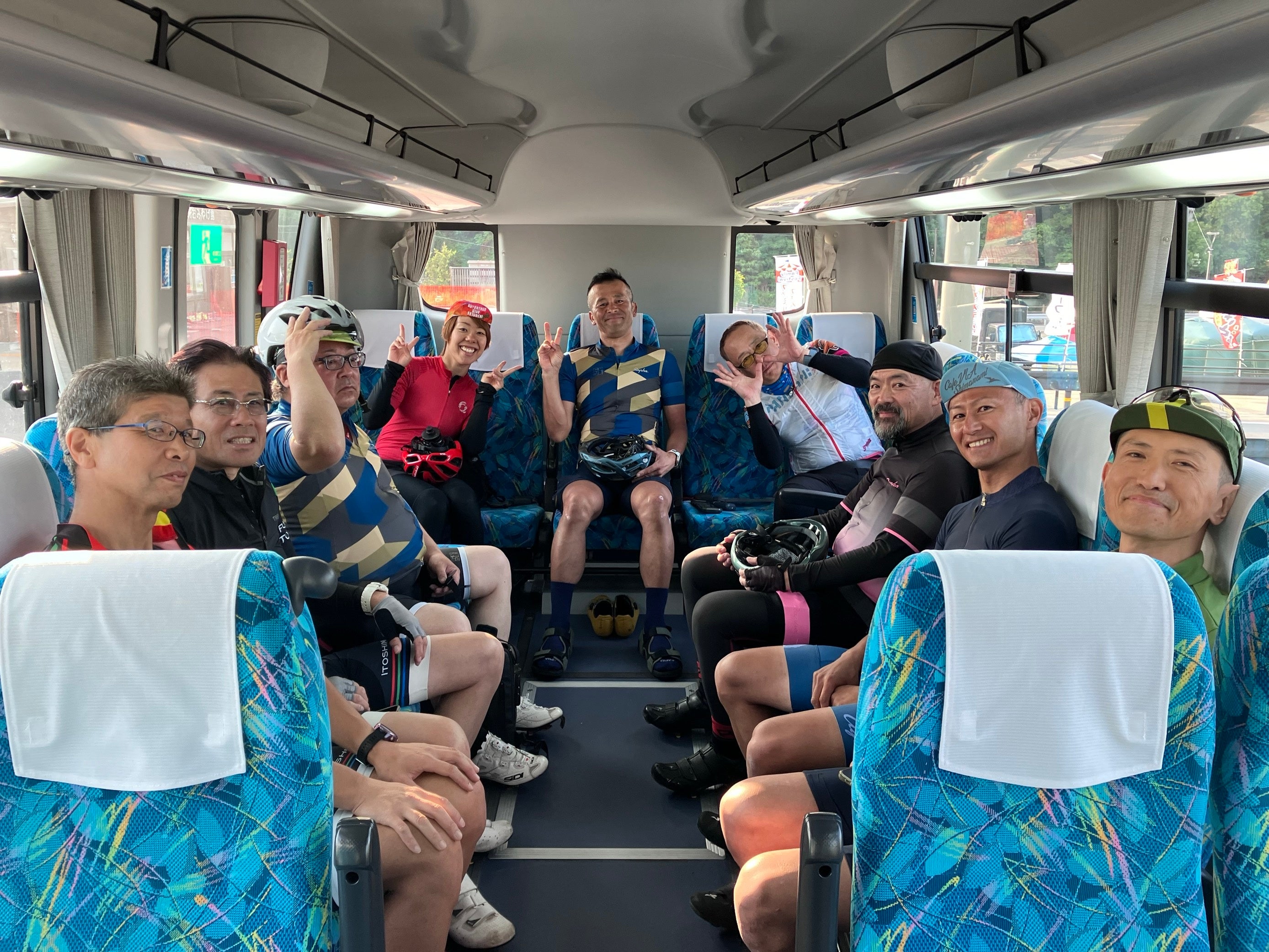 ・バス車内は後部座席を回転させてサロン席にすることができるので、サイクリングという共通の趣味をもった仲間とワイワイできること