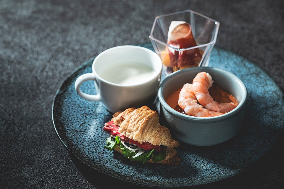 更にお1人さま1皿ずつセイボリープレートと、メロン半玉を器にしたフルーツポンチをご用意。艶やかに煌めくゼリーの蓋を崩しながら、メロンの果肉をすくってお召し上がりいただきます。