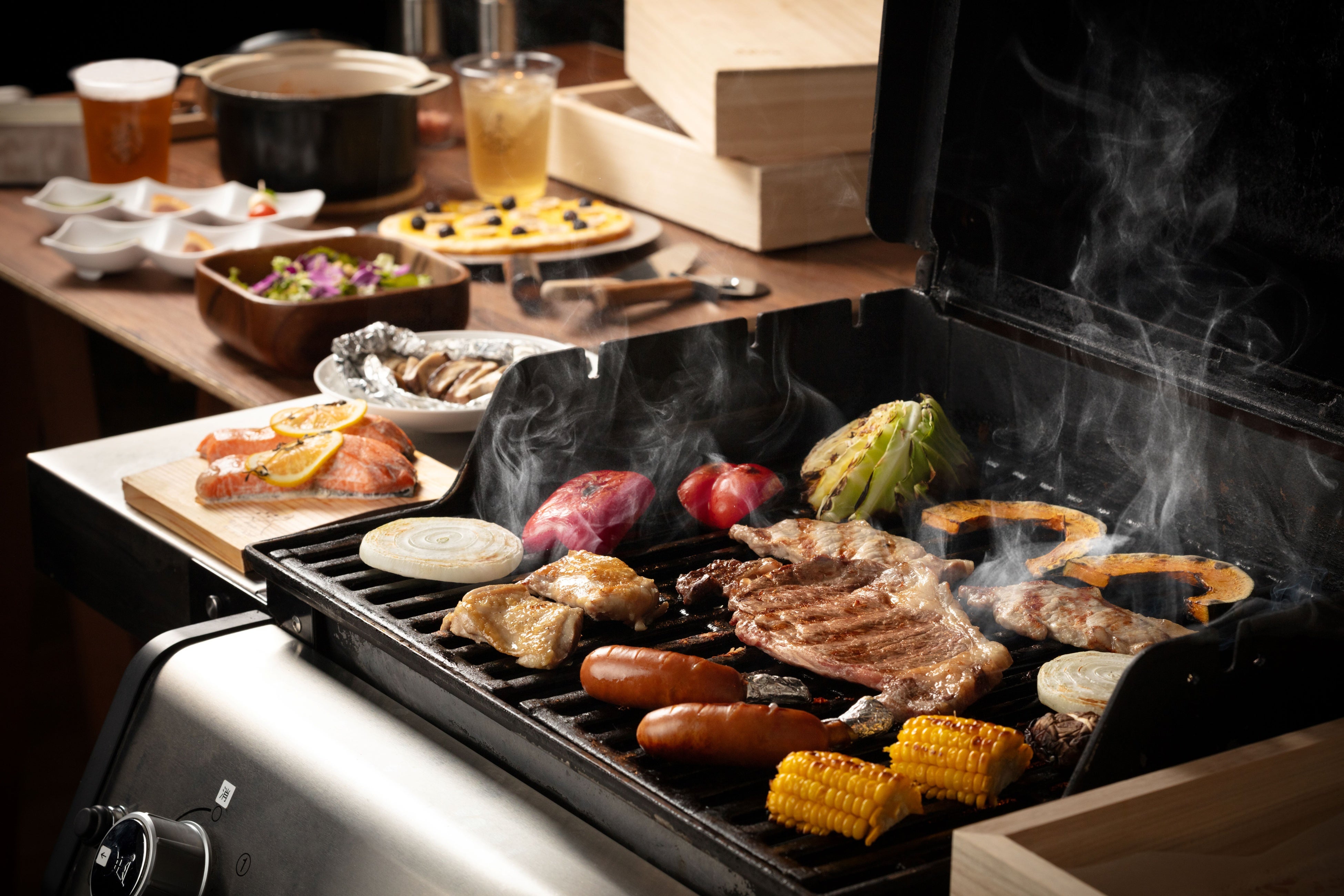 ・全天候型のBBQデッキ: ビニールカーテンで囲われた専用BBQデッキは、雨の日でも濡れずに利用できます。