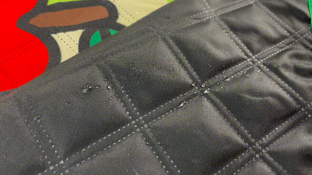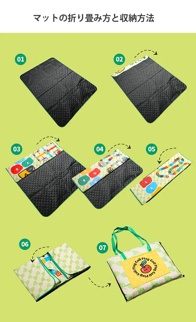 このマットは、ゲームがプリントされた表地、密織ポリエステル、ニードルパンチ加工したコットン、最下層は撥水加工を施したオックスフォード布の複数層で構成されており、地面の冷たさが伝わりにくいのが特徴です。