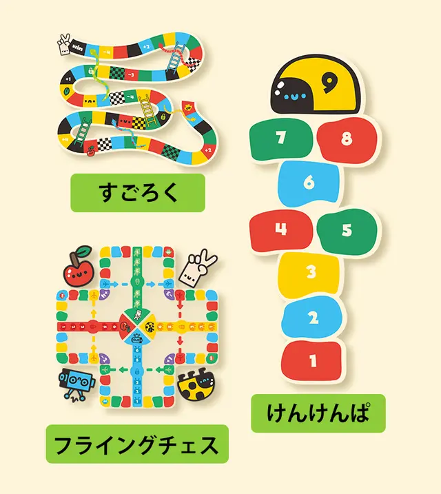 マットには「けんけんぱ」「すごろく」「フライングチェス」の3つのゲームがプリントされています。(ゲームのピース、ステッカーも付属しています。)