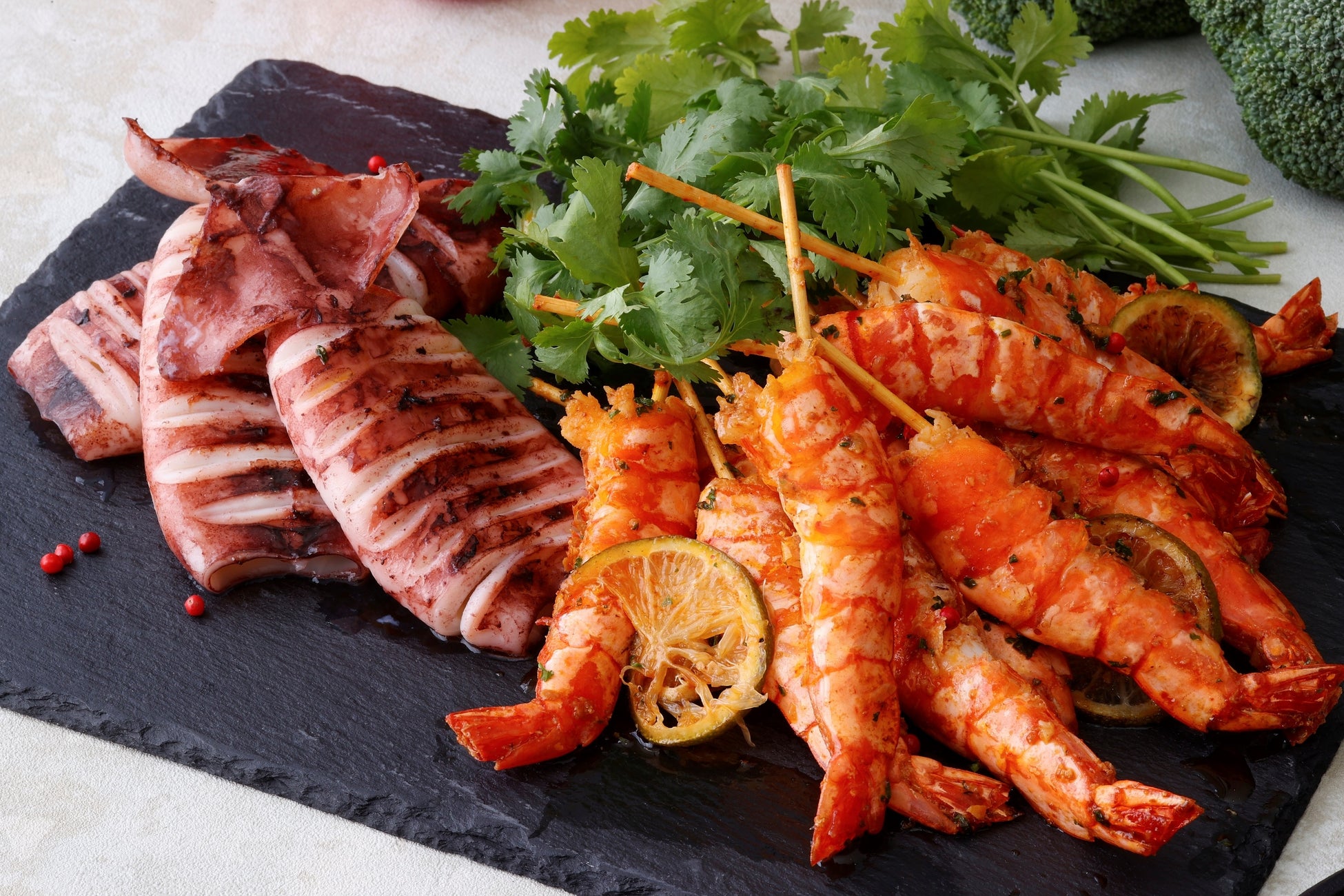 スペアリブ / プルドポークハンバーガー / ソーセージ / 魚介のグリル(イカ / 海老) / 夏野菜 / ピクルス / ナッツ / 鶏の唐揚げ / フライドポテト / カレーライス / フルーツ串 など