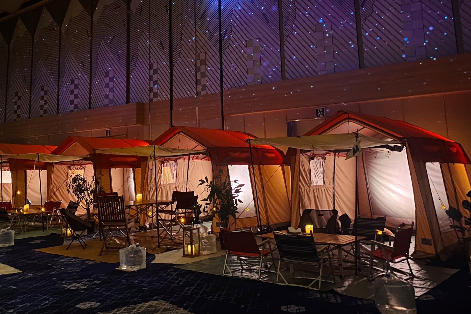 ホテルのメインバンケット「舞扇(まいおうぎ)」が1週間限定でグランピング会場になる「ビア・グランピング2024」は、アウトドアで使用する本格的なテントを会場内に配し、豪快なお肉料理や新鮮な魚介のグリルをはじめとする多彩なお料理をブッフェ形式でご用意。鳥のさえずりや、涼やかな水の音などのヒーリング音楽の中で、移ろいゆく時間をプロジェクションマッピングで表現し、まるで森の中にいるかのような気分に浸りながらお過ごしいただけます。