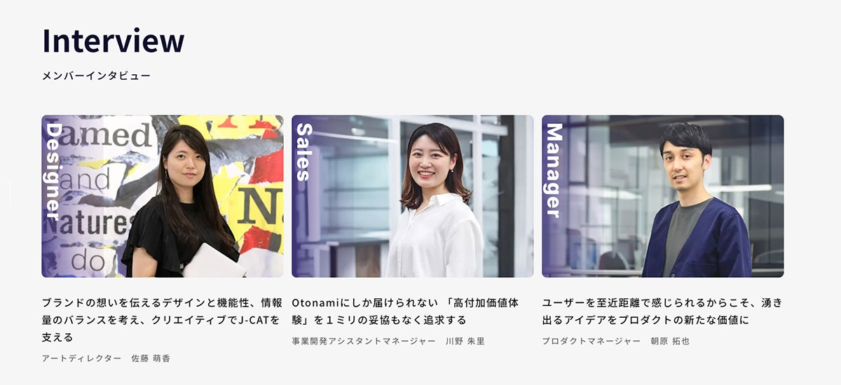 今回リニューアルした採用サイトでは、「想い・ビジョン」「事業内容と強み」「メンバー紹介とインタビュー記事」「働き方・カルチャー」など、J-CATについて多面的にご理解いただけるコンテンツを用意しました。