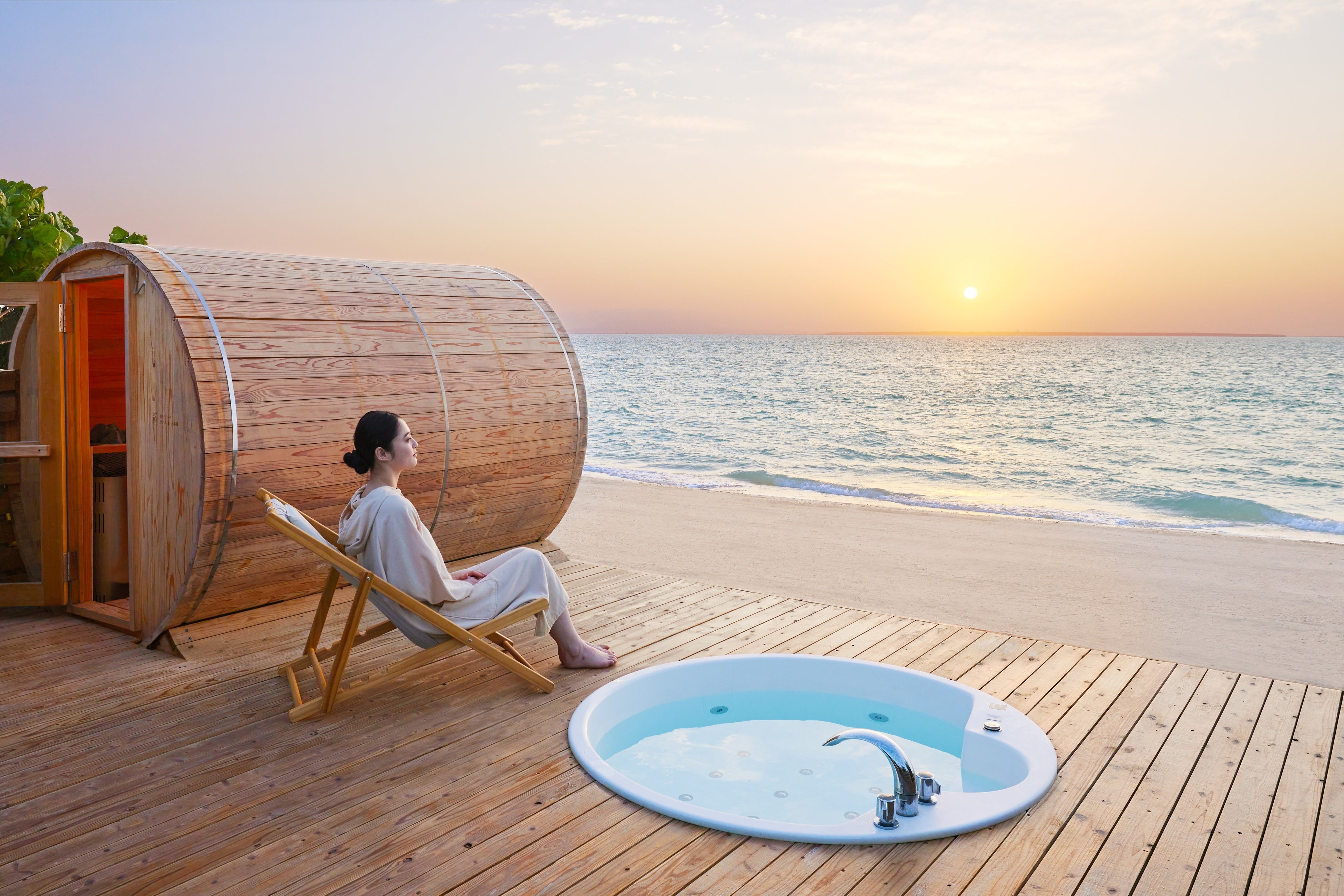ホテルに隣接するビーチに佇むバレルサウナでは、2024年6月1日よりサウナアクティビティの通年販売を開始しています。国内最大のサンゴ礁「石西礁湖(せきせいしょうこ)」が創り出す絶景と、心地良く流れる海風でととのう、リゾナーレ小浜島のバレルサウナだからこそ体験できるサウナアクティビティです。