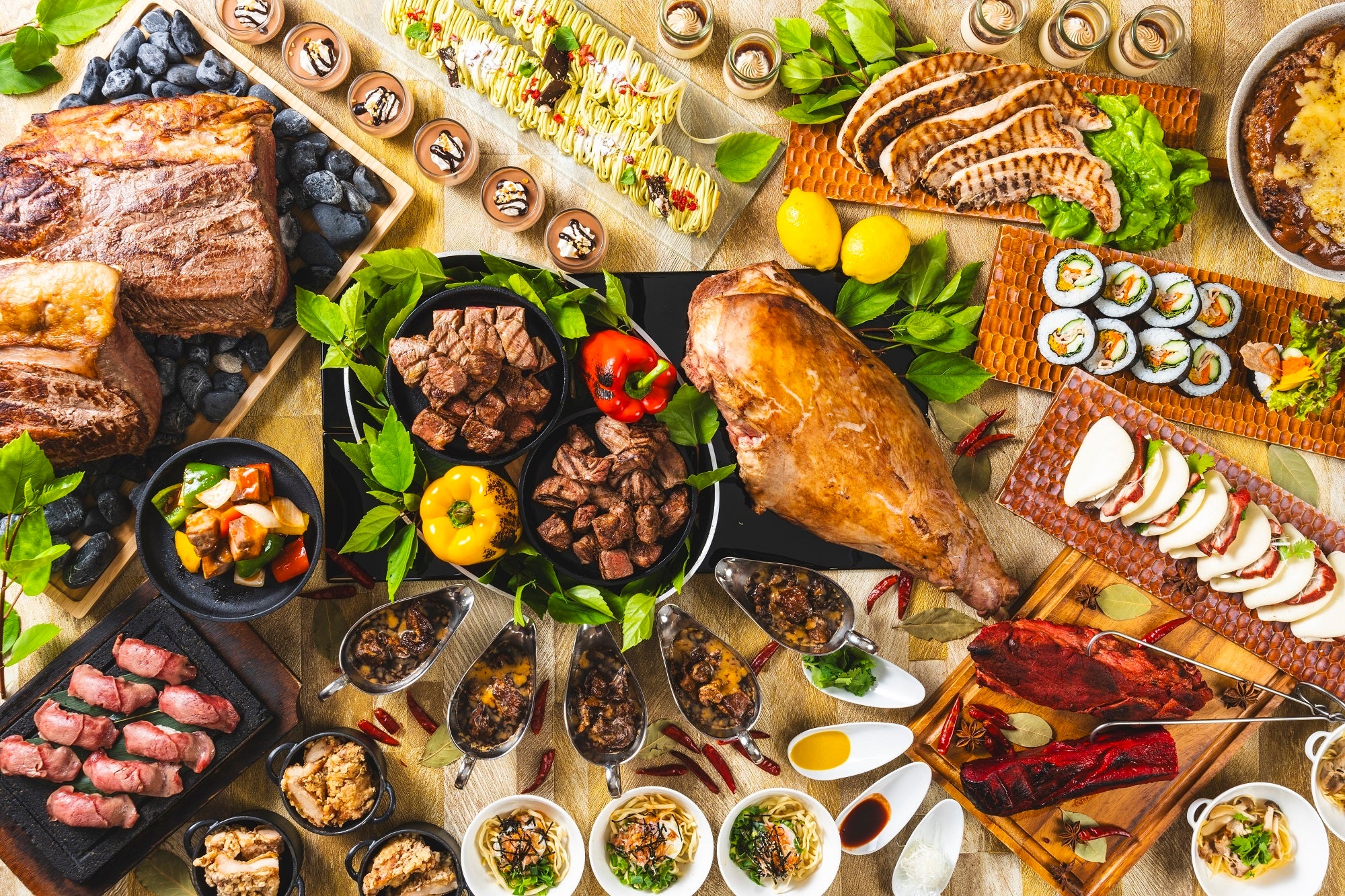 テラスからやさしく差し込む自然光と、海をイメージしたコンテンポラリーな空間が広がるビュッフェレストラン「スリユン」では、沖縄の暑い夏を吹き飛ばすスタミナ満点の20種類の肉料理をメインとしたお食事を、ビュッフェ形式でご用意いたします。料理に合うビールやワイン、ノンアルコールカクテルもオプションでお楽しみいただけます。