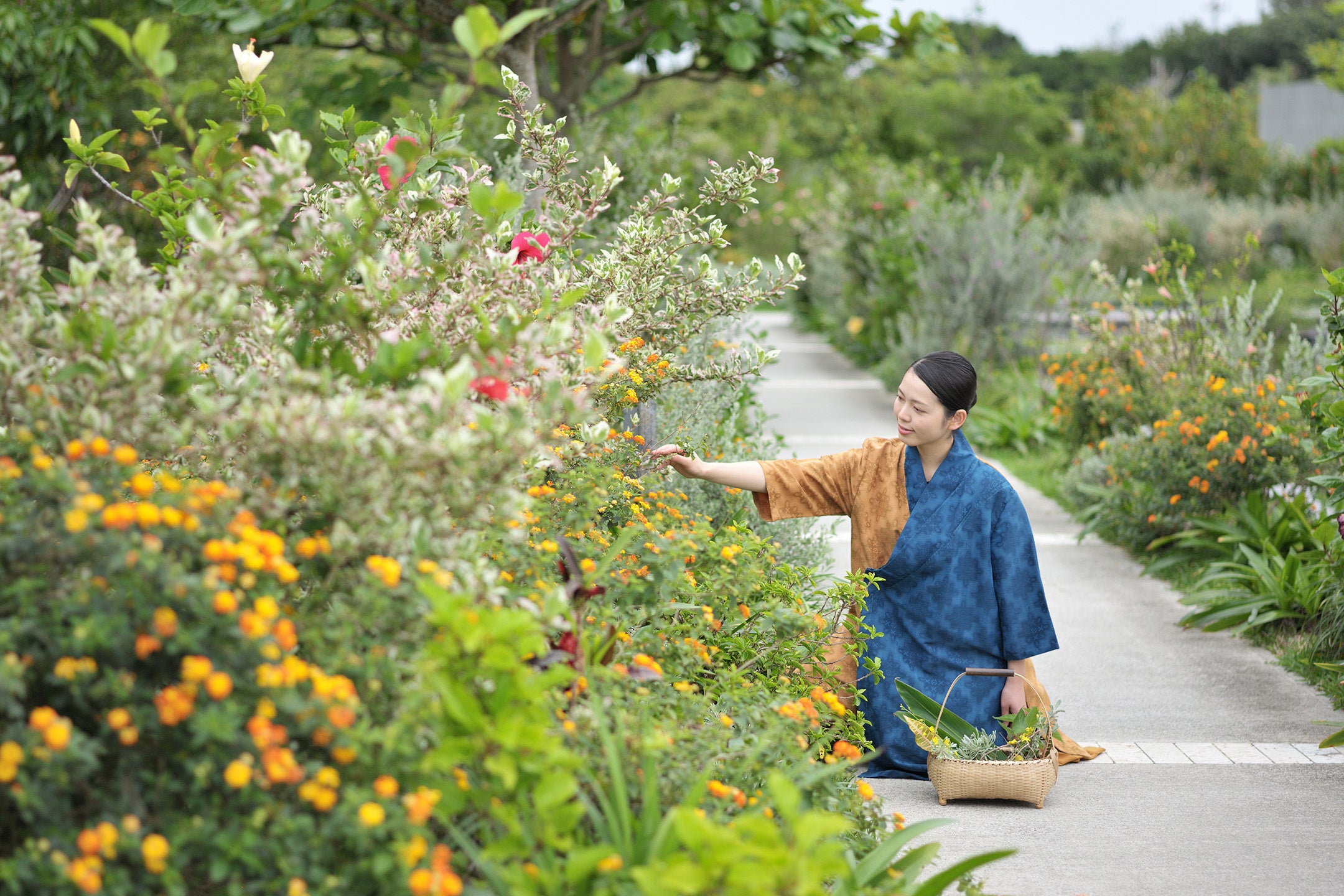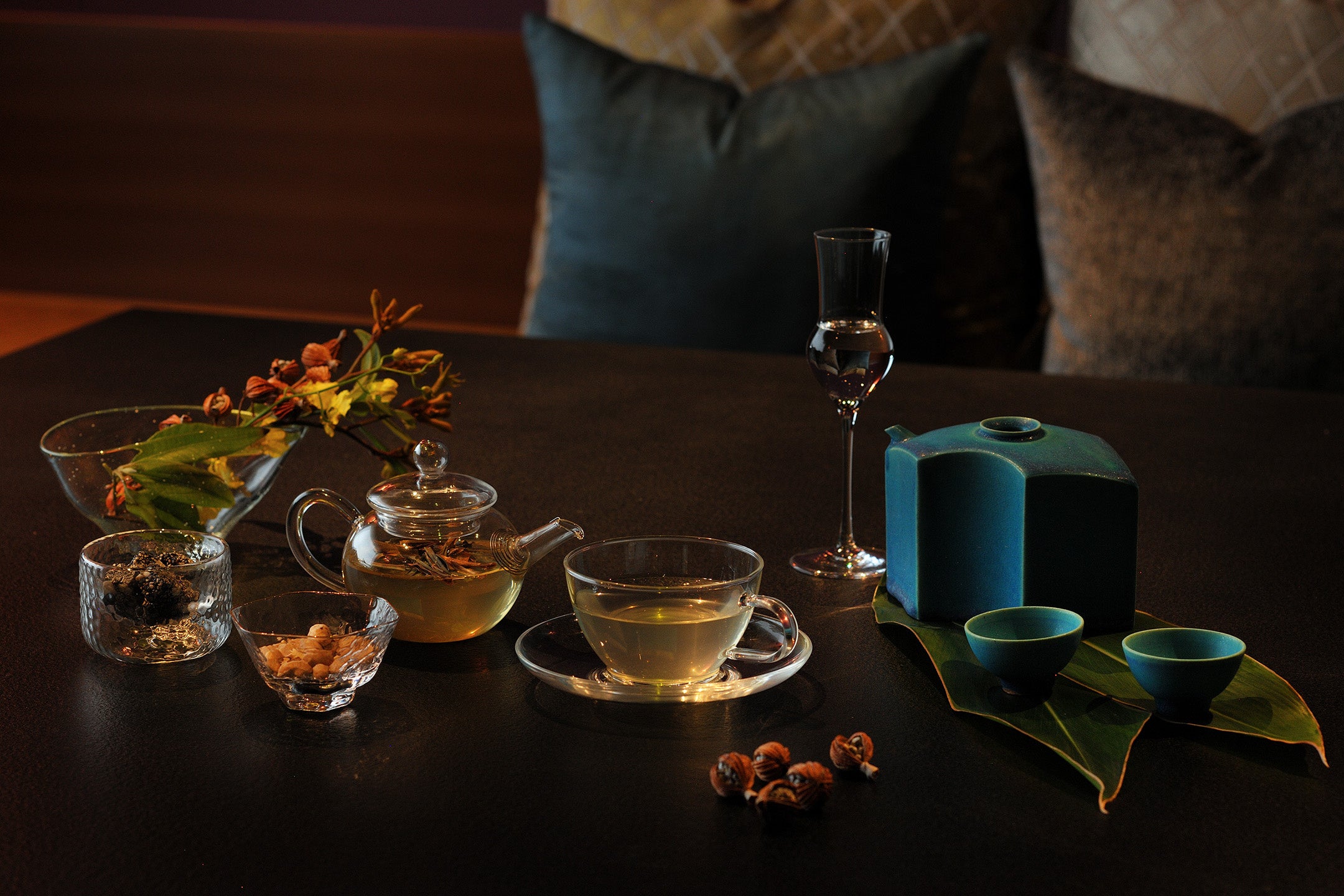 眠りにつく前の時間には、収穫したハーブを使ったハーブティーに泡盛を合わせる「茶酒」を楽しみます。星のや沖縄のスタッフがお勧めするレシピを試しながら、好みの味わいを見つけます。施設内のキッチンスタジオ「ゆがふキッチン」に隣接する「キッチンガーデン」や畑から収穫したハーブで作るハーブティーはフレッシュのまま楽しんだり、ドライにしたり、楽しみ方はさまざまです。「茶酒」や収穫した草木の沖縄らしい秋の香りで心をほどき、ゆったりとした時間を過ごします。