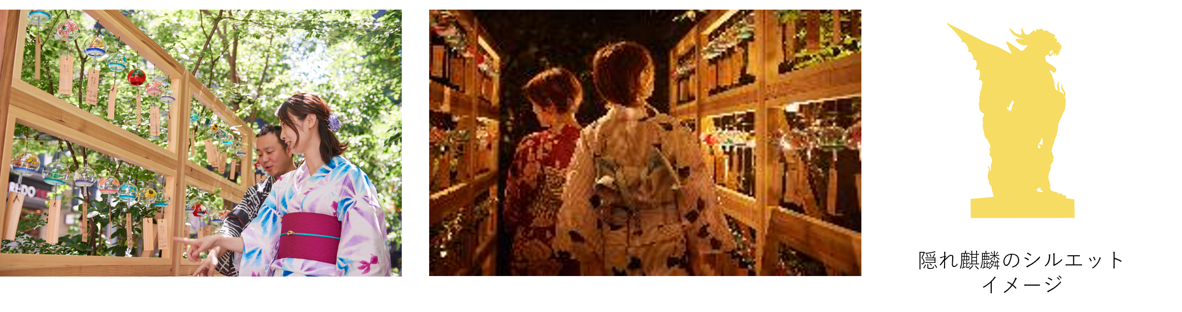 今年は福徳神社横の「森の風鈴小径」とCOREDO室町テラス けやき広場の2か所で江戸風鈴のスポットが登場します。福徳神社から福徳の森へと続く小径では、両側を約200個の江戸風鈴で装飾します。夜のライトアップも実施。また、名橋・日本橋の装飾のモチーフにもなっている麒麟が合計2体隠れており、風鈴を楽しみながら“隠れ麒麟探し”もお楽しみいただけます。