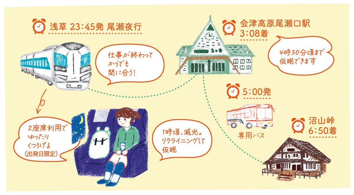 尾瀬に行くなら、東武鉄道の「尾瀬夜行」が便利です。浅草を23時45分に出発し、快適な車両で眠っている間に尾瀬に到着。翌日早朝から行動できるので、週末の時間を有効活用でき、ゆっくりと尾瀬散策を楽しめます。