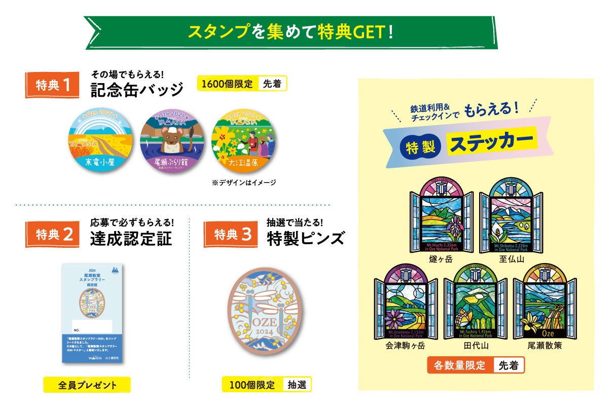 尾瀬散策スタンプラリーのスタンプを獲得すると「記念缶バッジ」がもらえるほか、スタンプラリーを達成すると「達成認定証」がもらえます。さらに、スタンプラリー達成もしくは登山チェックインポイントのスタンプ獲得で、抽選で当たる「特製ピンズ」にご応募いただけます。