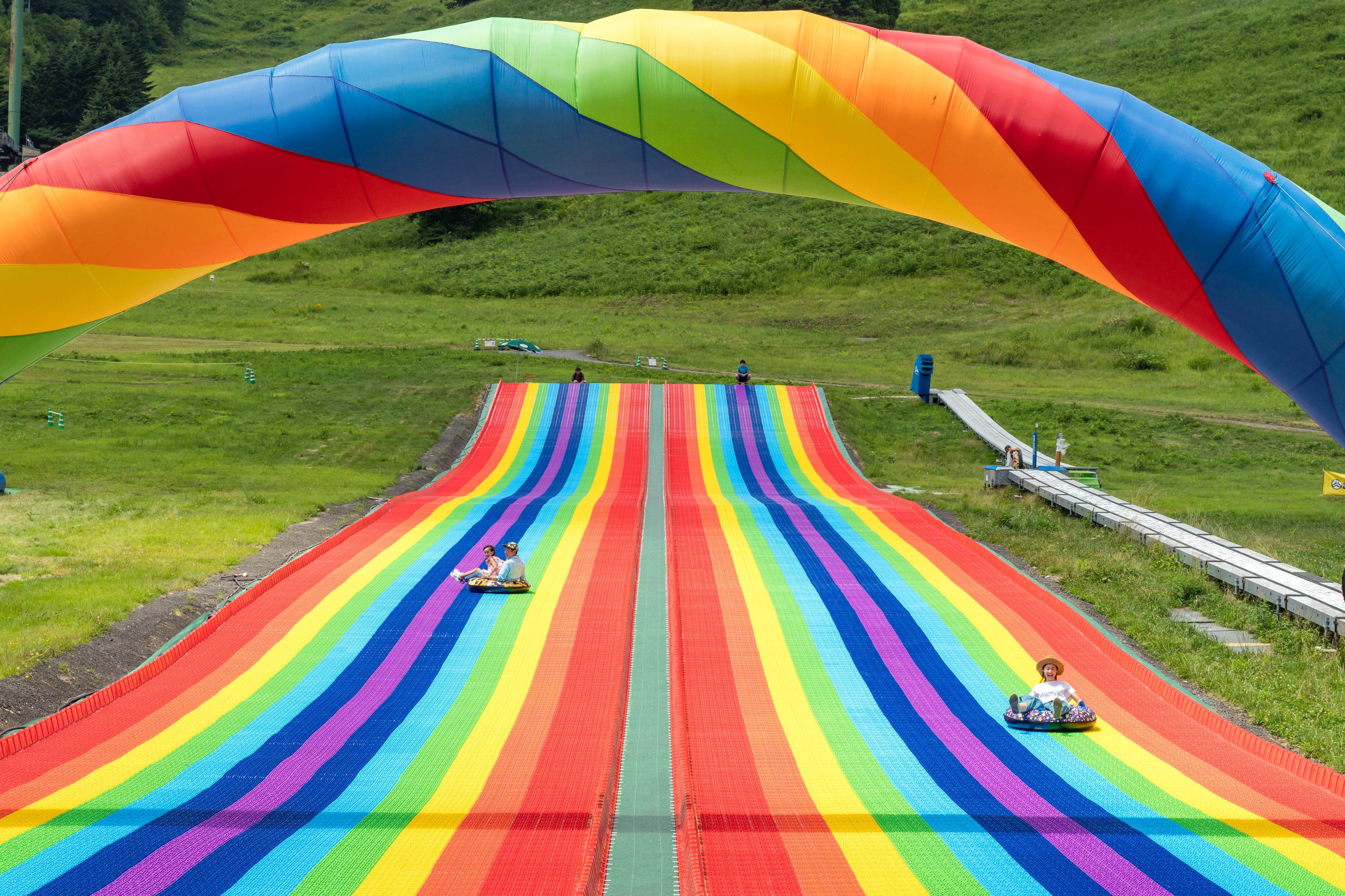 広大なゲレンデに映えるレインボーカラーのスライダーは、約100mの長さをチュービングに乗って、疾走感を体感いただけます。夏だけでなく、秋まで楽しむことができます。