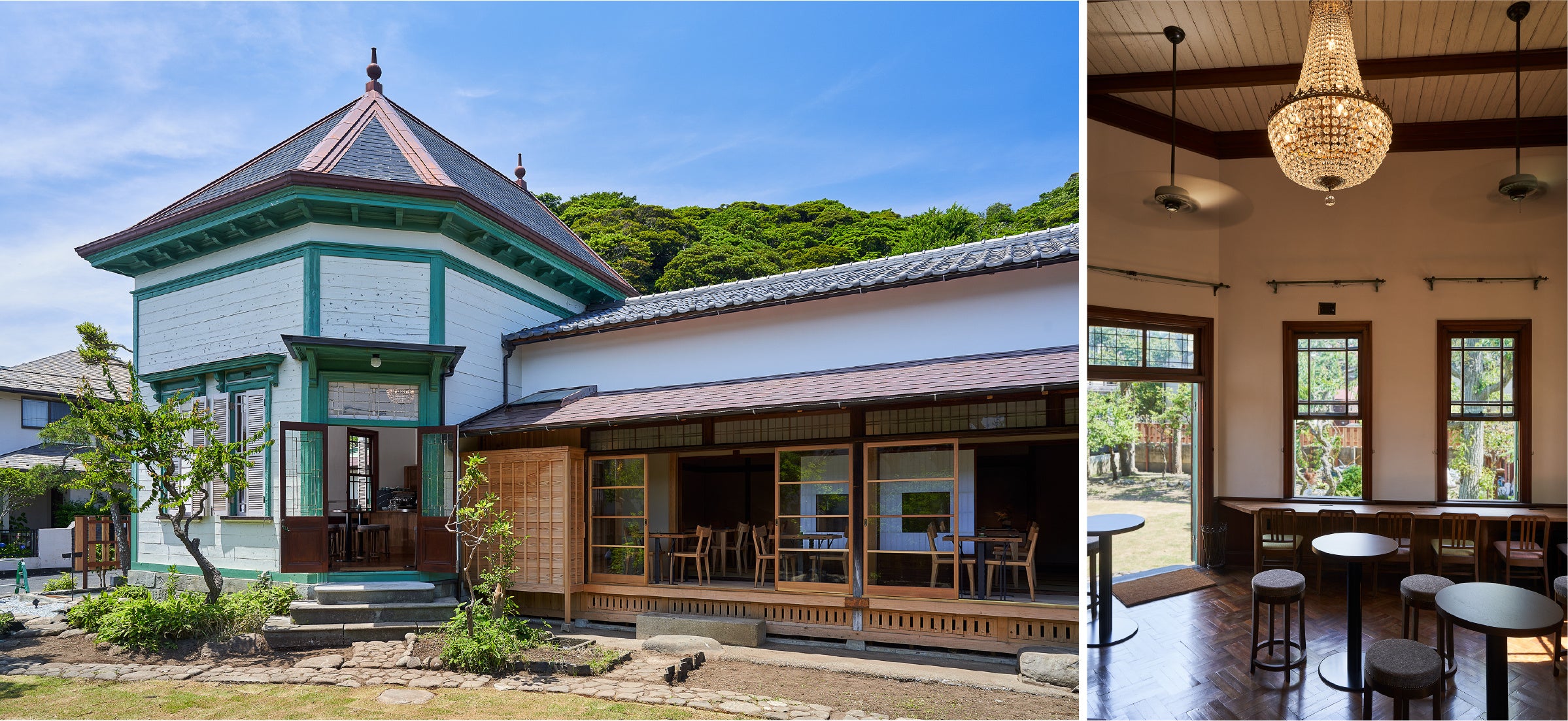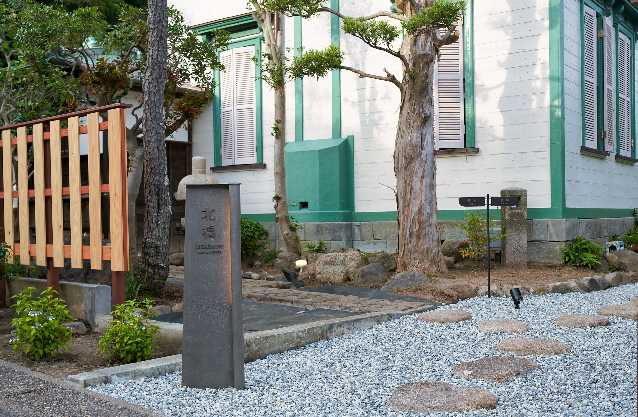 「旧加賀谷邸」は明治後期(推定)に建てられた洋館と日本家屋が調和した特徴的な外観で、長谷エリアのランドマークとして愛され続けてきました。犀北館グループ(さいほくかんグループ)が重要建築物保存の取り組みの一環として再生を行い、この度「鎌倉 北橋」として生まれ変わります。古き良き空気感の漂う日本家屋側で手打ち蕎麦を、ダンスホールとして活用されていた天井の高いモダンな洋館側ではカフェとしてシングルオリジン珈琲を提供。そして敷地内には緑溢れる庭もあり、四季折々の風景が皆さまをお迎えします。