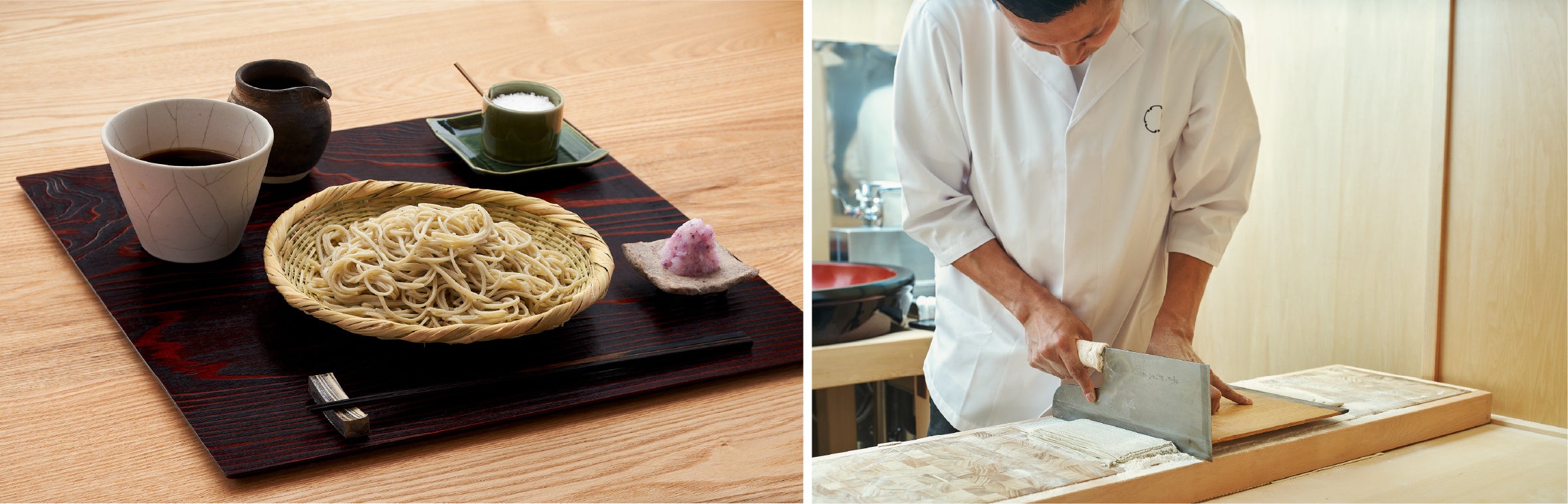 「鎌倉 北橋」では提供する蕎麦や珈琲だけでなく、目に触れる様々な物にもこだわりを持って厳選しています。器は、日常に溶け込むシンプルで洗練された美しさに定評のある作家 渡邉由紀氏のものを使用し、蕎麦や素材を生かした料理の数々を引き立てます。また、店の顔となる看板は八雲茶寮(目黒区)の門扉なども手掛けた、鉄作家の田中潤氏が製作。重厚感とモダンな雰囲気が融合した看板が皆さまをお迎えします。