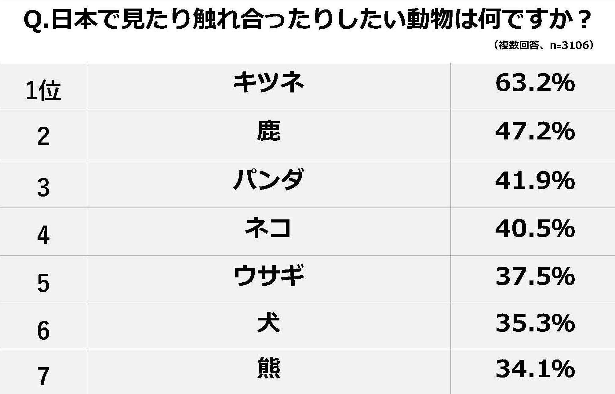 日本を訪れた際に動物を見たり触れ合ったりできるスポットに「絶対にいきたい」または「できれば行きたい」と答えた人に対し、動物の種類について複数回答形式で聞きました。1位は「キツネ」(63.2%)で、唯一過半数以上の票を集めました。次に多かったのは「鹿」で、47.2%でした。またペットとして親しまれている猫(40.5%)や犬(35.3%)もランキングの上位となりました。※2