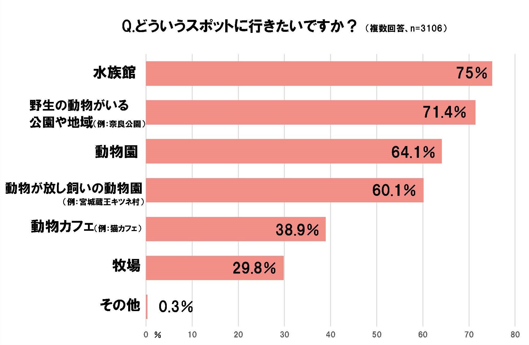 日本を訪れた際に動物を見たり触れ合ったりできるスポットに「絶対にいきたい」または「できれば行きたい」と答えた人を対象に、どういうスポットに行きたいか聞きました。複数回答形式で質問したところ、1位は「水族館」で75%でした。2位は「野生の動物がいる公園や地域」(71.4%)となり、多くが奈良公園などの野生動物がいる場所を訪れたいと考えていることが分かりました。このほか、宮城蔵王キツネ村のような「動物が放し飼いの動物園」も60.1%となり、人気が高いことが分かりました。