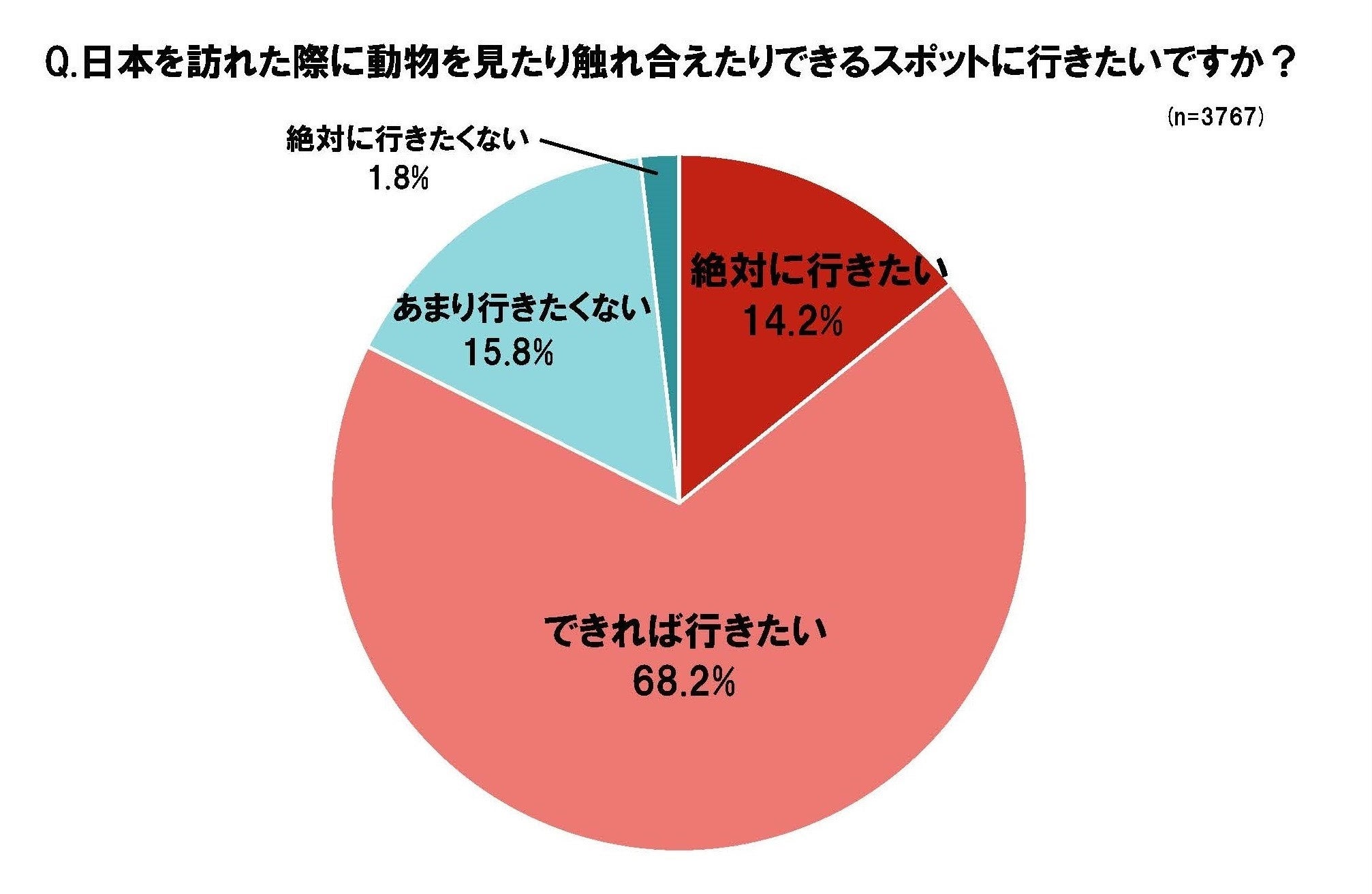 調査では、日本を訪れた際に動物を見たり触れ合ったりできるスポットに行きたいかどうか聞きました。最も多かったのは「できれば行きたい」で68.2%でした。また「絶対に行きたい」は14.2%となり、全体の82.4%が「日本で動物を見たり触れ合ったりできるスポットに行きたい」ということがわかりました。
