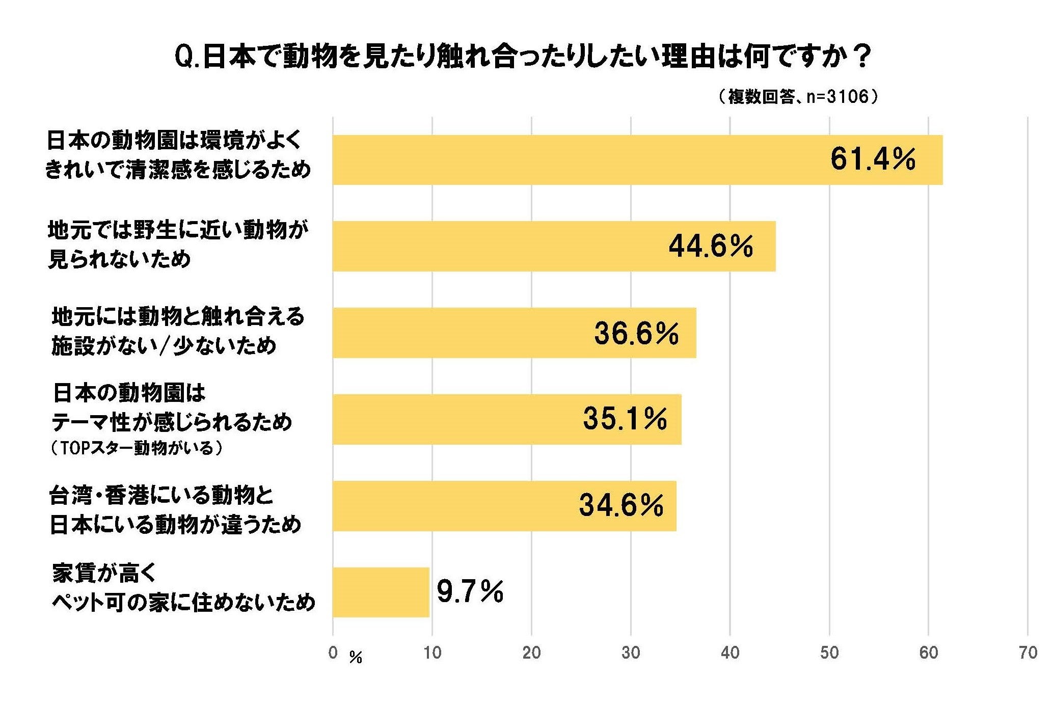 日本を訪れた際に動物を見たり触れ合ったりできるスポットに「絶対にいきたい」または「できれば行きたい」と答えた人を対象に、理由について複数回答で聞きました。最も多かったのは「日本の動物園は環境がよくきれいで清潔感を感じるため」で61.4%が選択しました。これに「地元では野生に近い動物が見られないため」(44.6%)、「地元には動物と触れ合える施設がない/少ないため」(36.6%)が続きました。