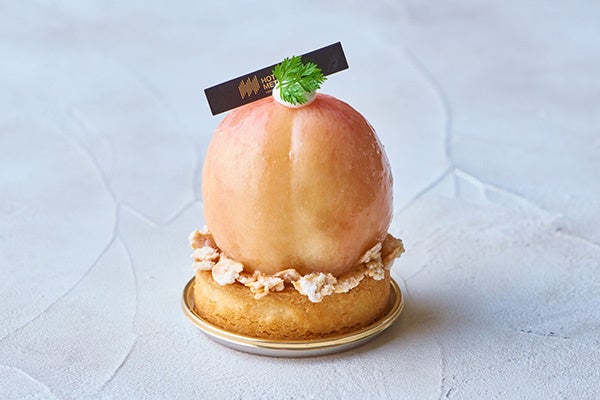 フレッシュな桃をまるごと1個使用しました。桃の中には、ふんわりと軽い食感でベルベーヌ風味のカスタードムースが詰まっています。サクサクのアーモンドタルトとジューシーな桃が絶品な季節のタルトです。
