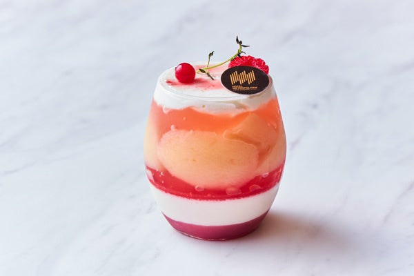 赤桃ゼリー、白桃ムース、木苺のクーリを重ね、白桃のコンポートと桃のゼリーをのせ、トップは生クリームと赤桃のソースで飾りました。旬のみずみずしい桃の果肉を味わうと共に、様々な食感を楽しめる、桃尽くしの贅沢なヴェリーヌです。