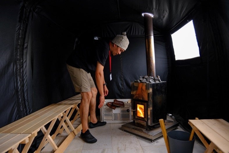 参加者の皆さんには美しい海を背景に、既設の2種類のサウナとイベントならではの各種テントサウナを体験いただきました。