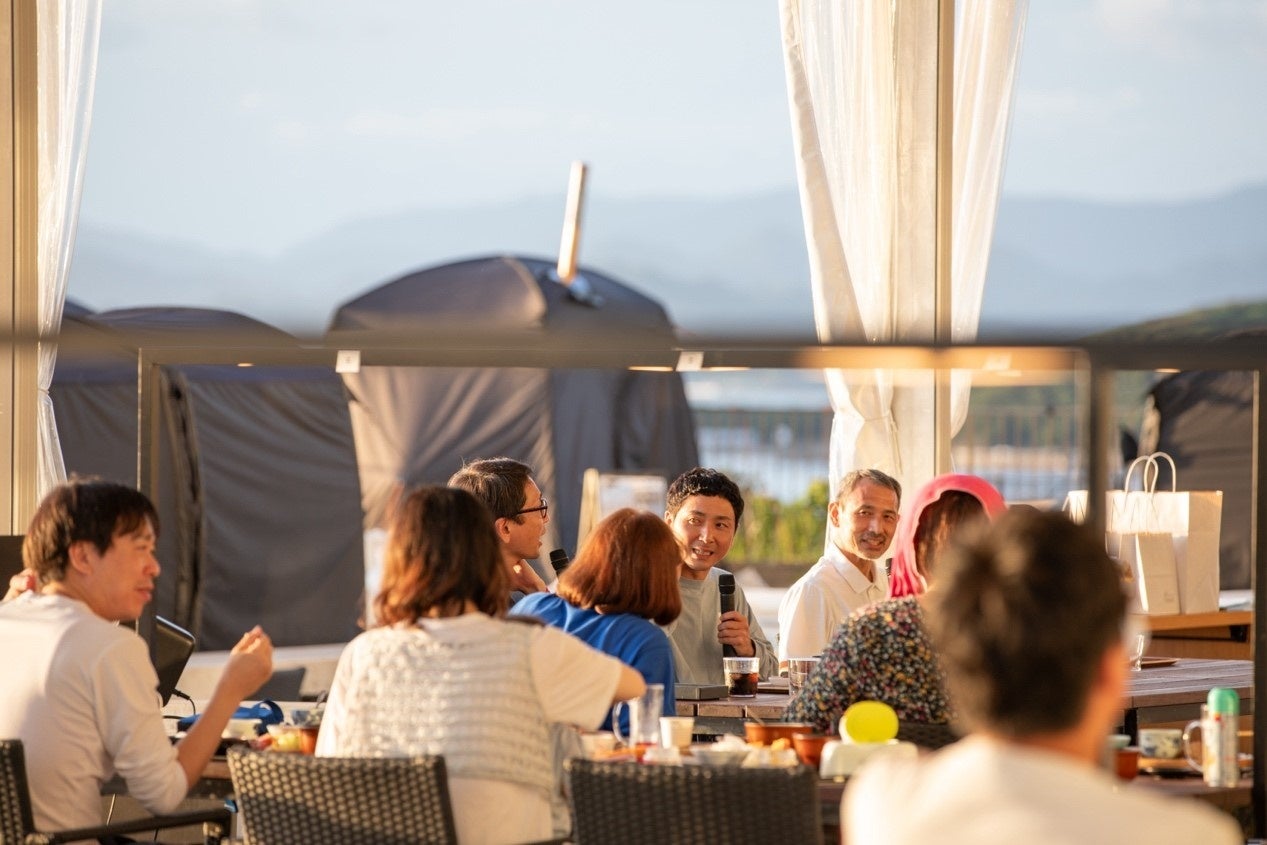 夕暮れ時に始まったディナートークショーには、ゲストとしてサウナ愛好家として知られるマグ万平さん、タナカカツキさん、とくさしけんごさんが登壇。彼らによるトークライブでは、サウナにまつわる様々なエピソードや専門知識が共有され、参加者の皆さんは笑いや驚きに包まれました。