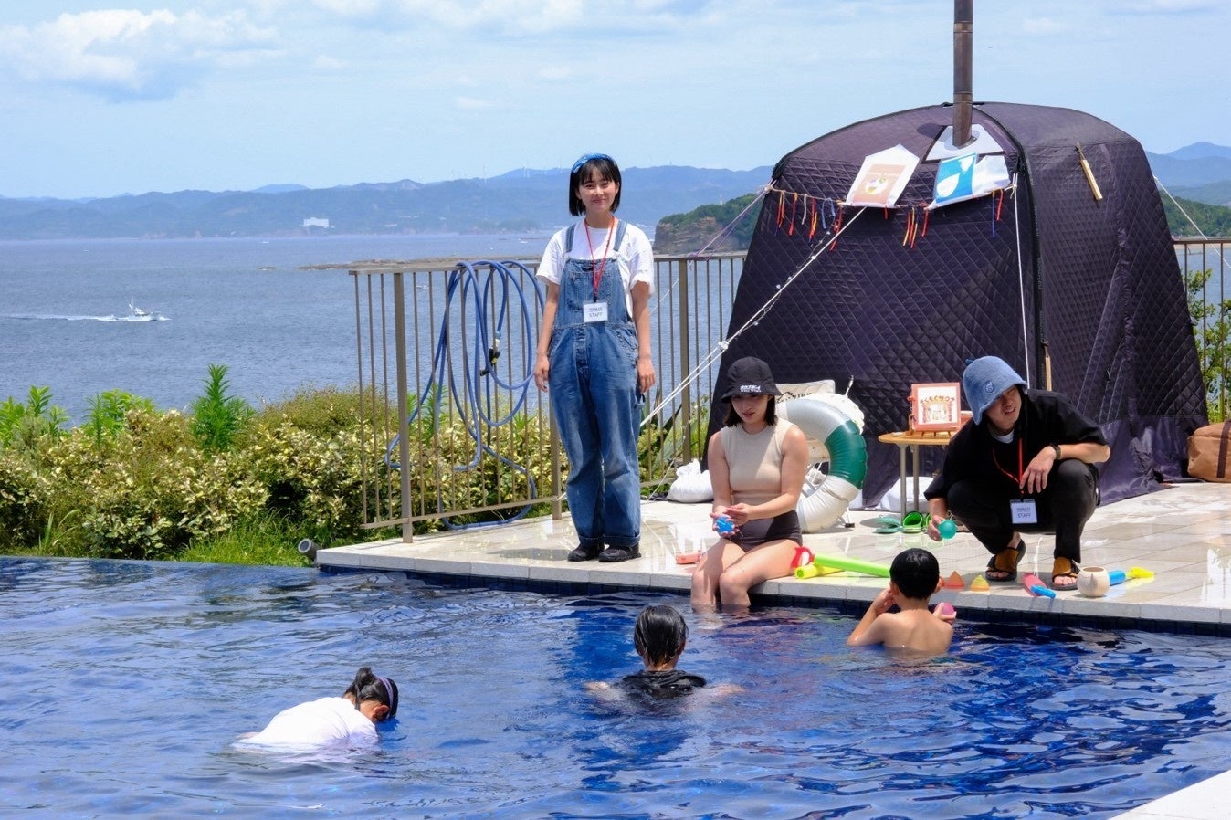 子供連れのご家族もご参加いただき、子供たちがテントサウナや水風呂で楽しんでもらえる工夫を凝らしました。サウナを出た後は、プールで泳いだり、テラスで遊んだりする姿も見られました。