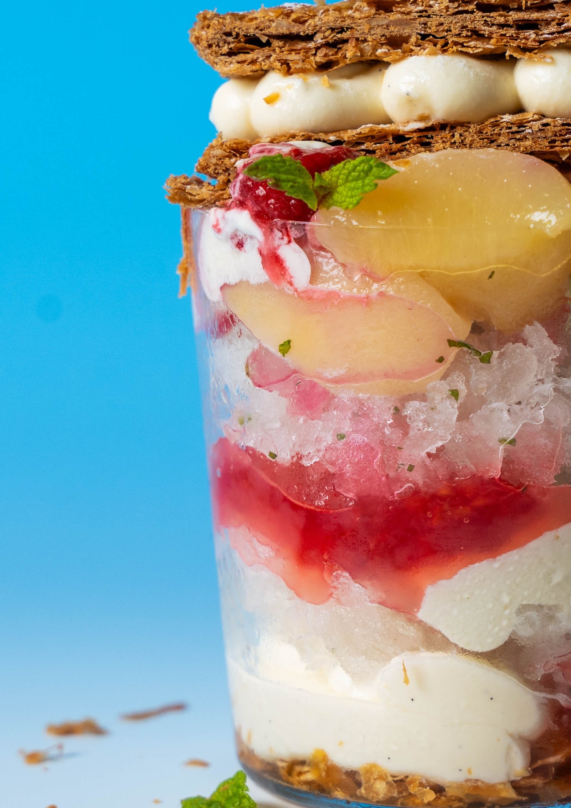 ピーチメルバの桃・フランボワーズ・バニラクリームを基本に、レモンとフレッシュハーブのベルベーヌやミントが効いた爽やかなグラニテに、パイ生地やゼリー、バニラクリームを加えてバランスの取れた味わいに。さらに、ごろっとした桃やパリっと食感が楽しいミルフィーユをトッピングしました。