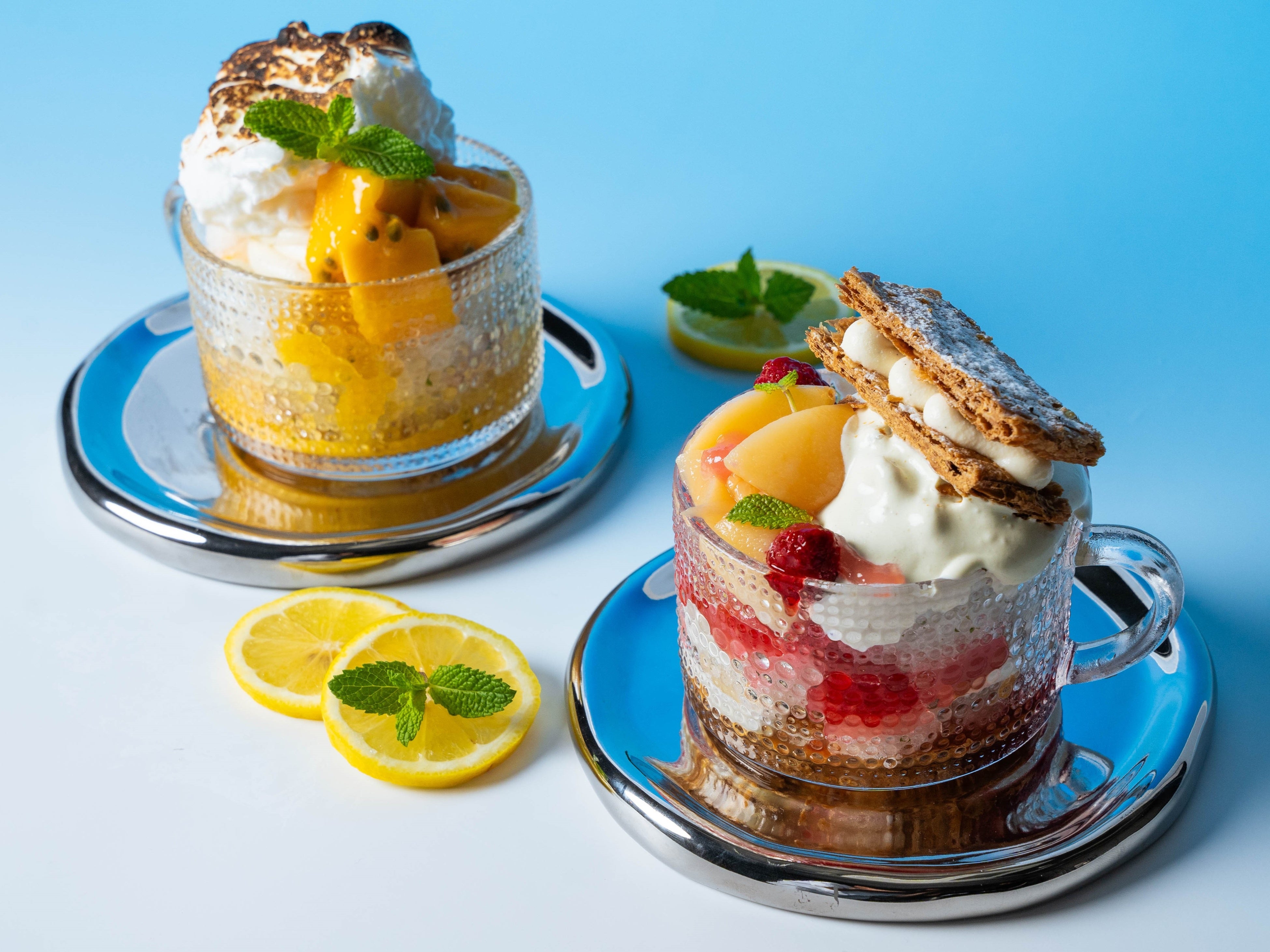 この夏、日本の夏の風物詩である「かき氷」とフランス菓子「アントルメグラッセ(アイスケーキ)」を掛け合わせた、新感覚のかき氷を2種類ご用意しました。自家製のレモンとミントのグラニテをベースに、旬の桃やマンゴーを加え、全体をクリームで包み込みました。ミルフィーユやタルト生地のパリッとした食感がアクセントとなり、一口ごとに異なる食感や風味をお楽しみいただけます。フレンチシェフの発想が光る、THE LIVELY 大阪本町でしか味わえない、この夏限定のハイブリッドスイーツをぜひご堪能ください。