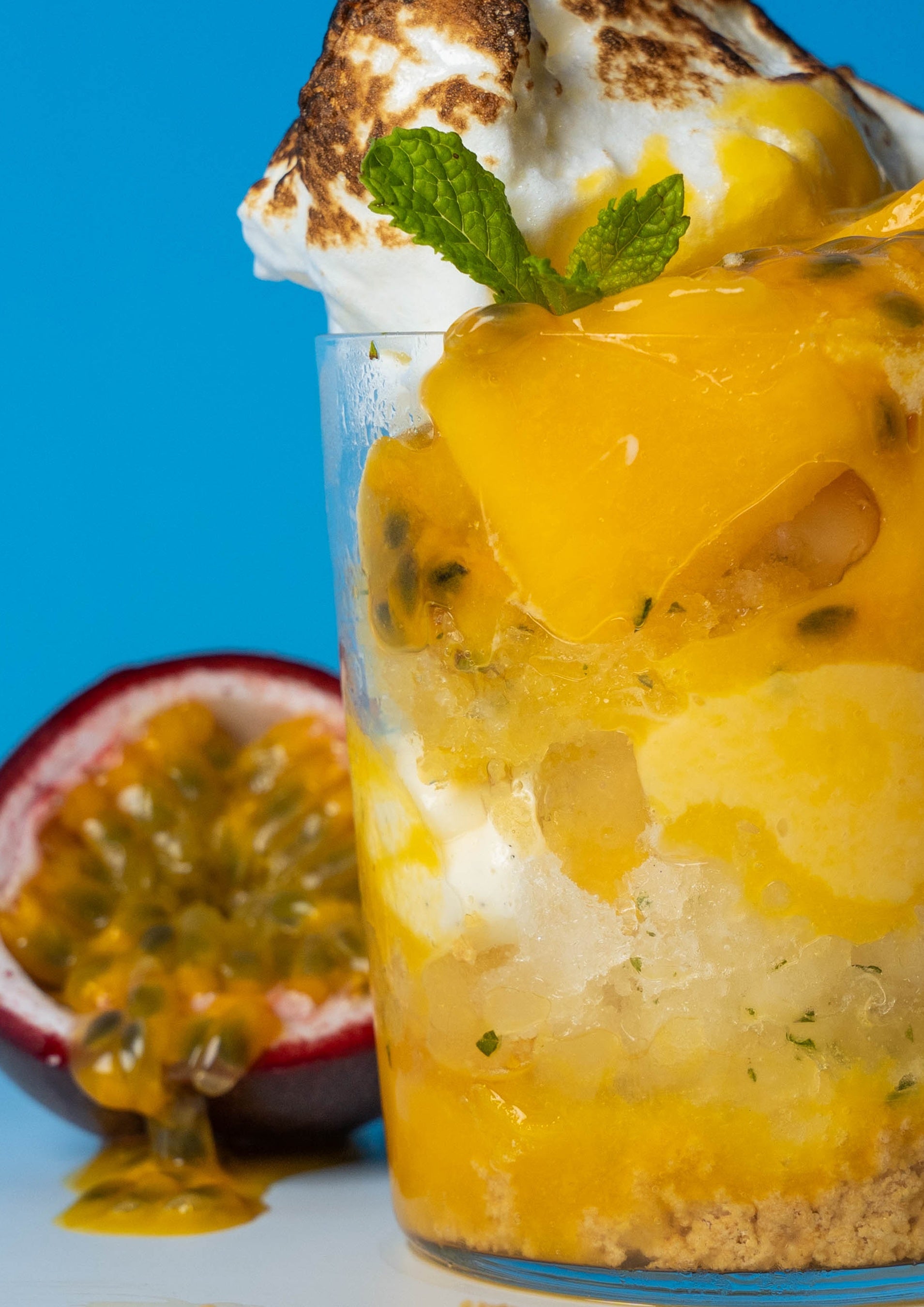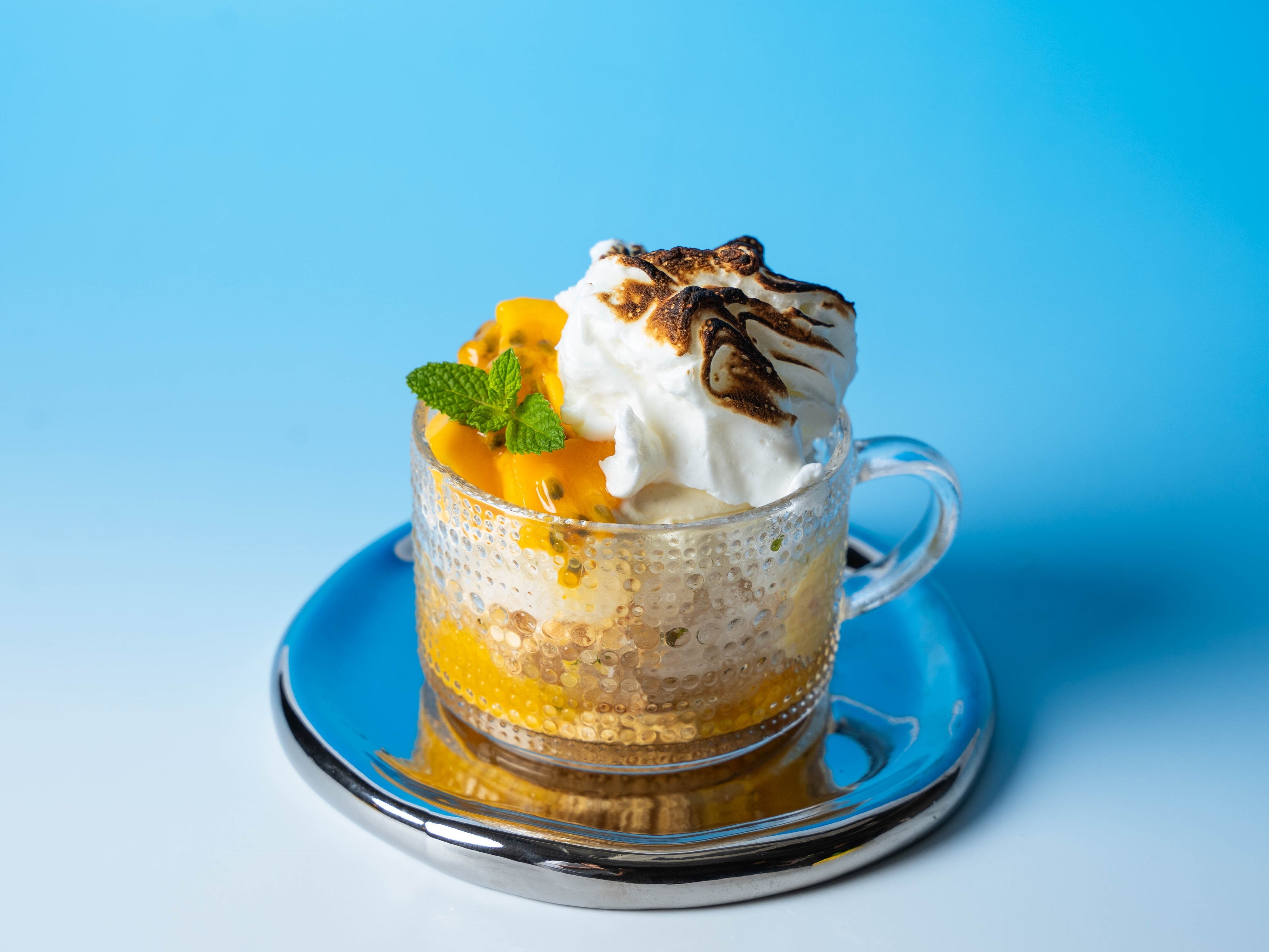 タルト・オー・シトロンのレモンクリーム・タルト生地・メレンゲを基本に、レモンとフレッシュハーブのベルベーヌやミントが効いた爽やかなグラニテに、旬のフルーツのマンゴーやパッションフルーツを加えました。さらに、焼き色のついたふわっとした食感のギモーヴをトッピングしました。