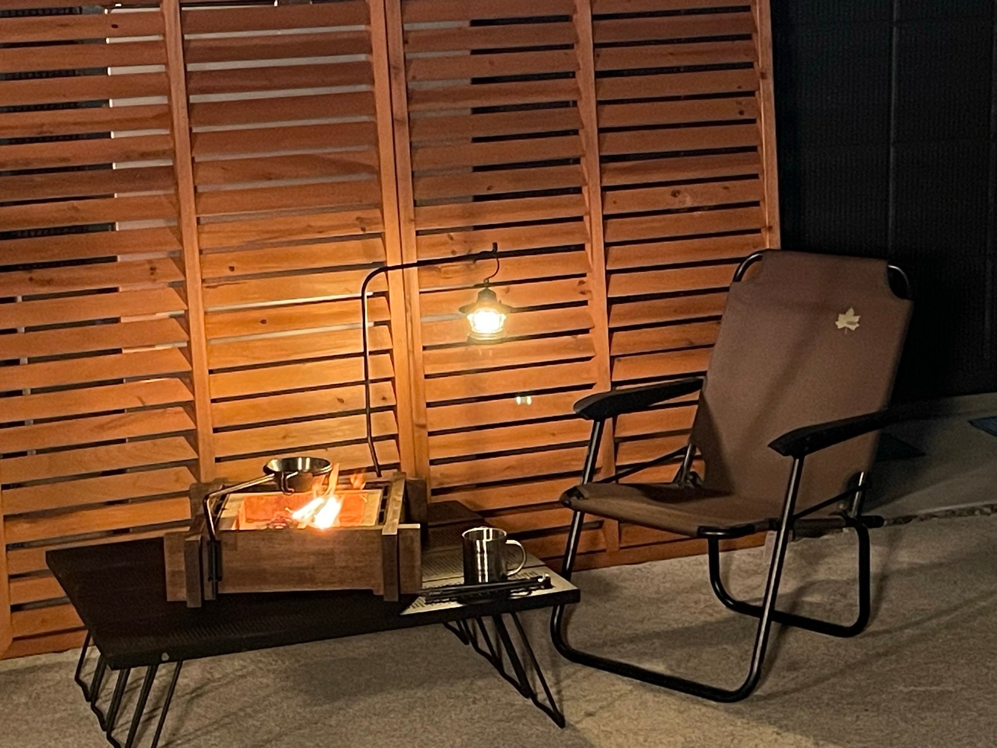 独自の空冷式断熱性能でキャンプテーブルに置いて焚火ができ、直火禁止のキャンプ場でも使えます。