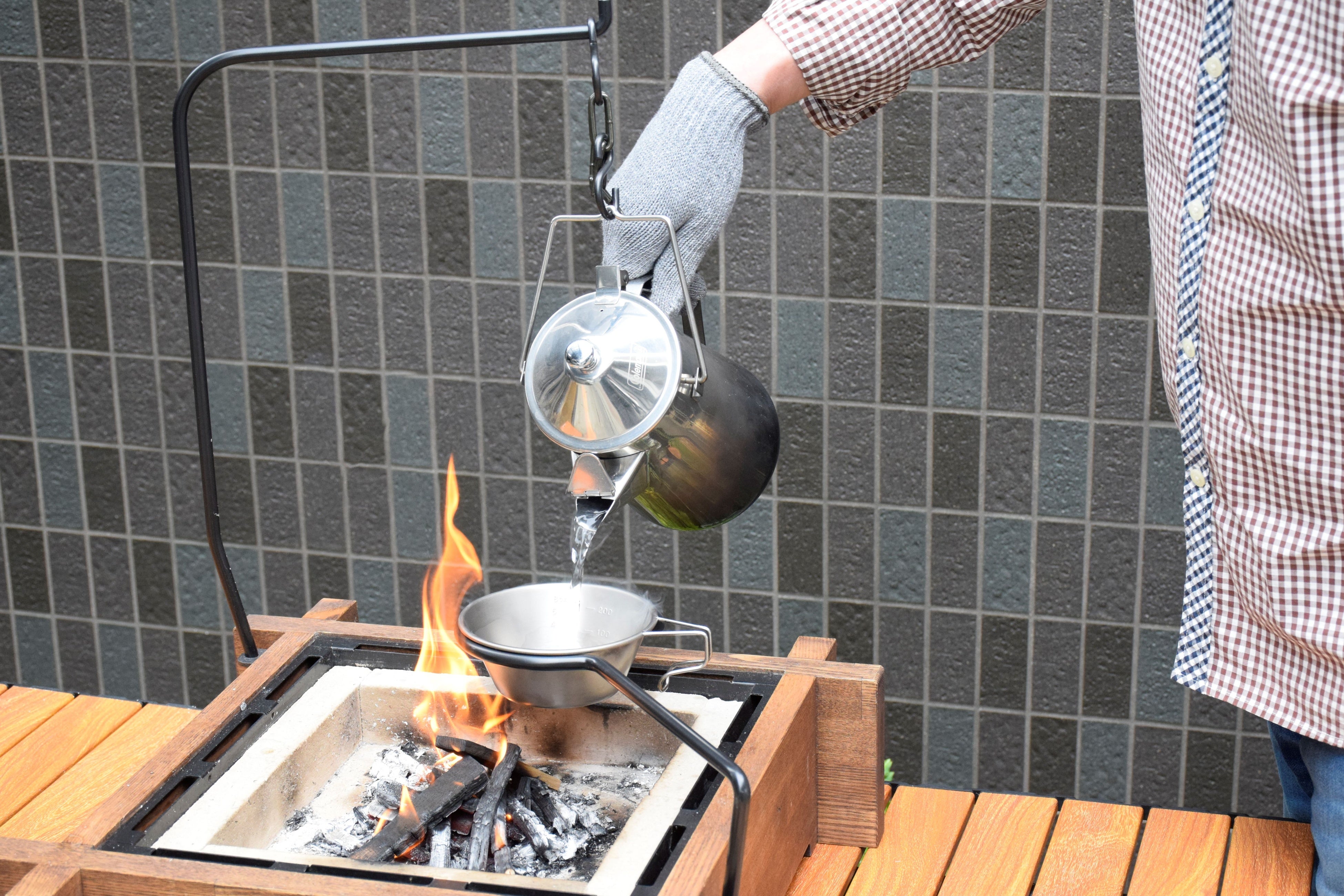 本体2か所に取り付けできるハンガーに鍋やケトルを吊るしたり、シェラカップを置くことができる機能を加え、便利さとスマートさを兼ね備え、見た目にも和風情を感じる独自のフォルムになっています。