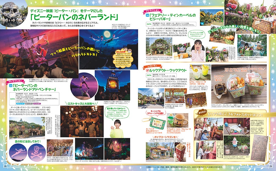 『アナと雪の女王』をテーマにした「フローズンキングダム」、『塔の上のラプンツェル』をテーマにした「ラプンツェルの森」、『ピーター・パン』をテーマにした「ピーターパンのネバーランド」の3つのエリアにあるアトラクションやレストラン、そしてフォトスポットなど、お子さんと一緒に楽しむ方法を詳しくご紹介しています。