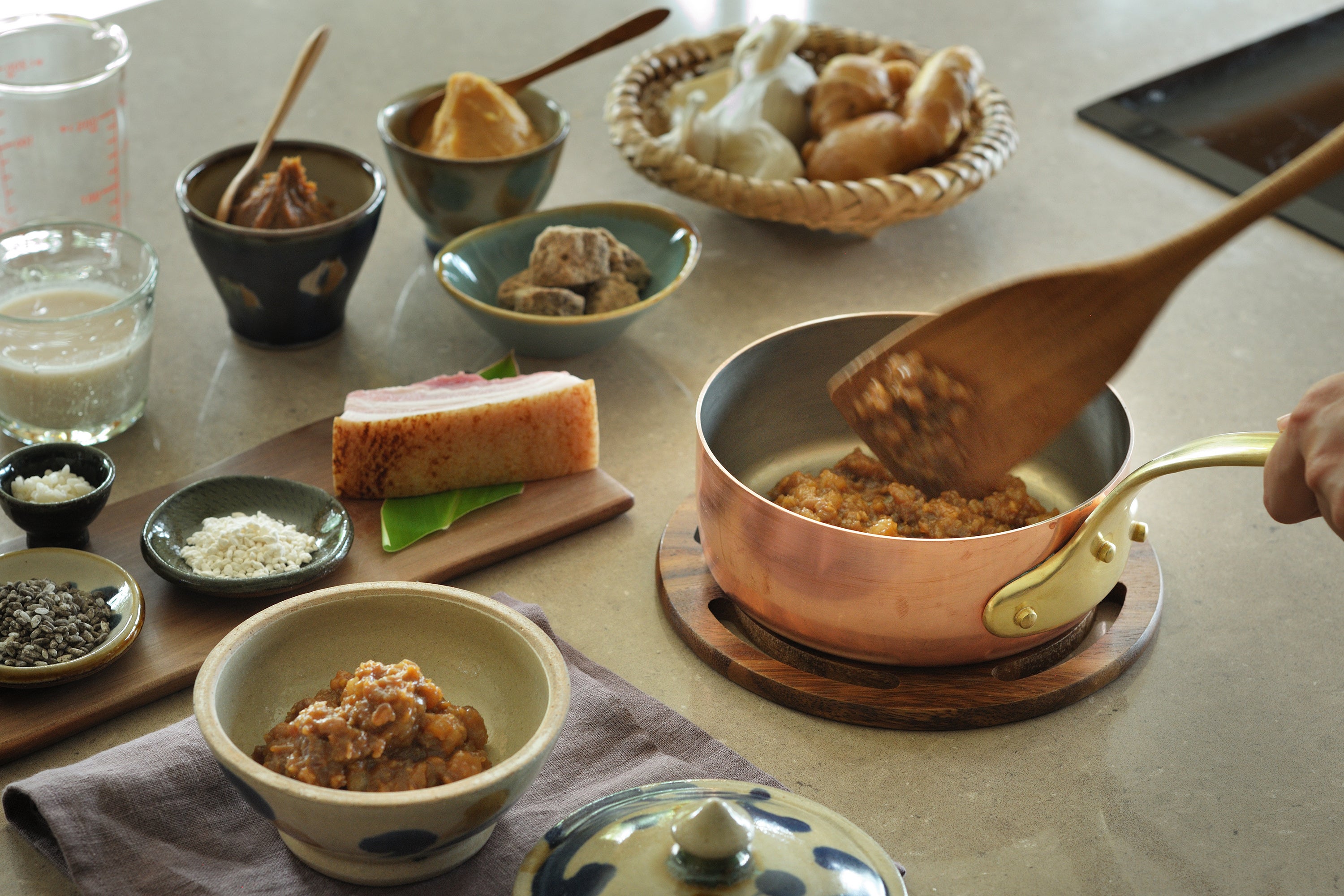 温暖多湿な沖縄は古くから発酵文化が根付く場所です。日本では古くから黄麹菌が酒造りに使われてきたのに対し、沖縄では伝統的に黒麹菌が使われてきました。黒麹菌の特徴は、酒の製造過程でクエン酸を大量に生成し、雑菌による腐敗を抑えることができるという点です(*4)。到着後には「黒麹」を中心に、泡盛、豆腐よう、味噌などの琉球王朝時代から続く沖縄の発酵文化や先人の知恵を学び、星のや沖縄内のキッチンスタジオ「ゆがふキッチン」で「アンダンスー」を作ります。泡盛の酒粕や久米島味噌などを使って丁寧に手作りした「アンダンスー」(*5)は滞在中の食事にも取り入れて味わいます。