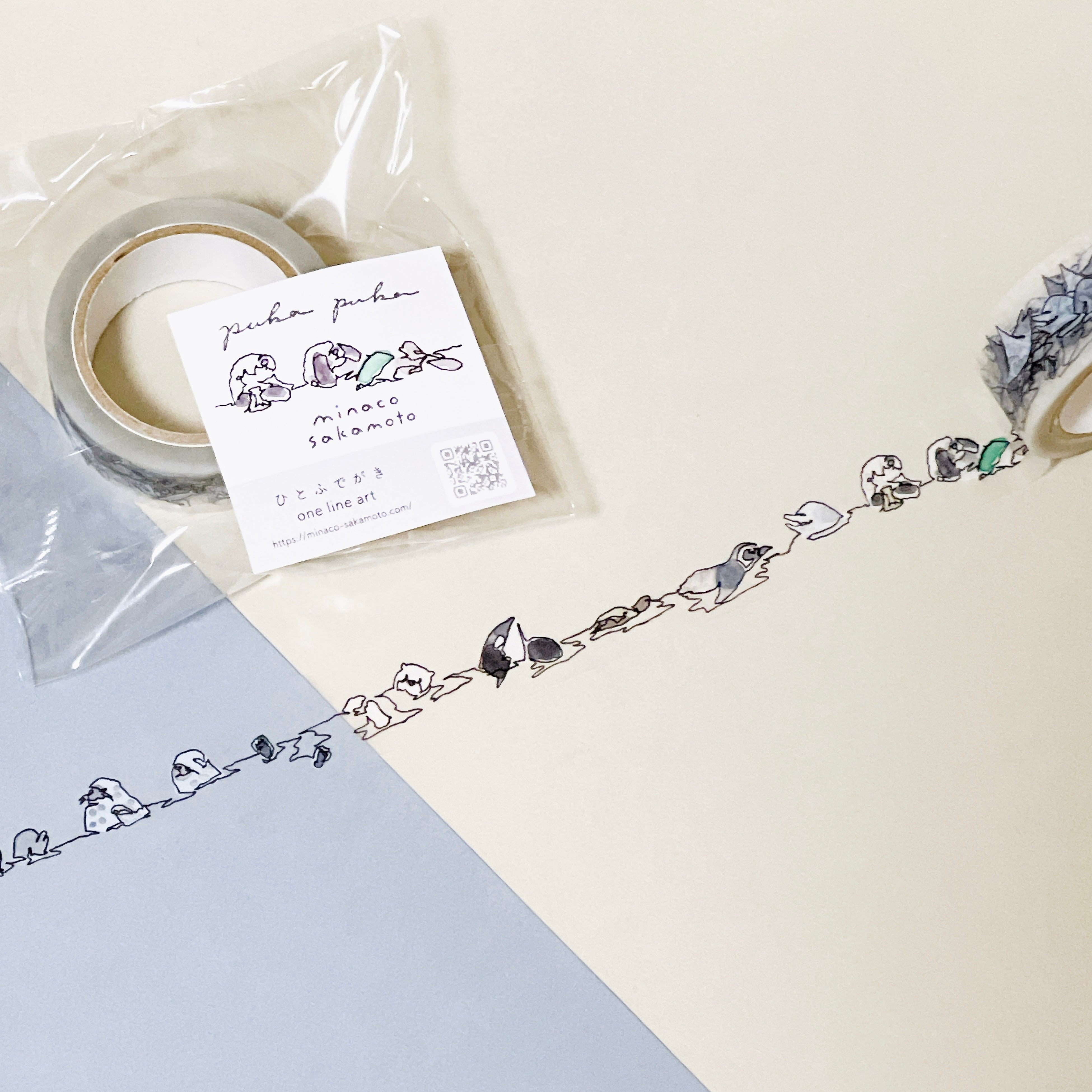 会期中、旅する水族館関連商品を税込1,500円お買上げごとに、ひとふでがき作家minaco sakamotoさん描き下ろしのクリアステッカーをプレゼントします。全6種類のステッカーはすべて集めるとひとふでがきの絵が完成します。