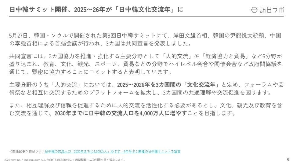 ほかにも「日中韓サミット開催、2025〜26年が”日中韓文化交流年”に」「世界旅客需要、前年比11%増」など インバウンド担当者必見の情報を1本のレポートに凝縮!
