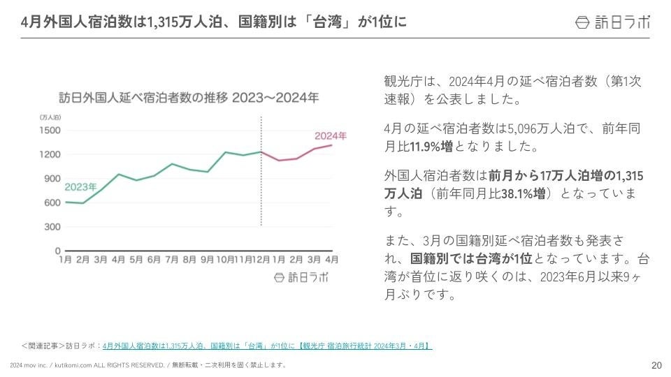 4月外国人宿泊数は1,315万人泊、国籍別は「台湾」が1位に
