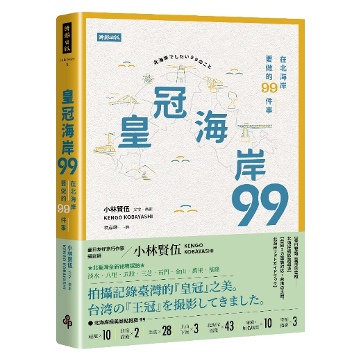 『皇冠海岸99:北海岸でしたい99のこと』は、フォトエッセイの形式で、小林賢伍氏のおすすめ穴場スポットや、食べ物、文化的風景など、皇冠海岸でしたい99のことを記しています。新北市の五股に始まり、八里、淡水、三芝、石門、金山、万里を経て基隆まで続く「皇冠海岸観光圏」の穴場スポット10ヶ所、宿泊ホテル 2件、グルメ28ヶ所、ハイキングと下海岸の散歩のスポット 3ヶ所、北海岸の景観 43ヶ所、秘境絶景10ヶ所、美しい風景の空撮3枚の計99ヶ所を紹介しています。小林賢伍氏は本書の取材を通じ 「北海岸は私の台湾での青春に欠かせない1ページとなった」と語っており、読者にも美しい写真を通して大切な1ページになってほしいと考えています。