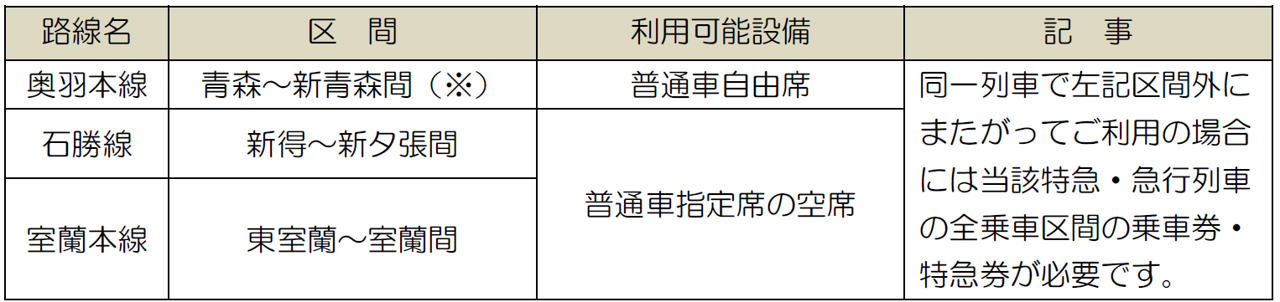 ・青い森鉄道線、いわて銀河鉄道線、北越急行線の普通列車もご利用可能。