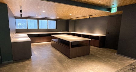 モダンでクールな印象の会場です。一角に30㎡のビュッフェのコーナーがあります。様々なスタイルの集まりにご利用いただけます。