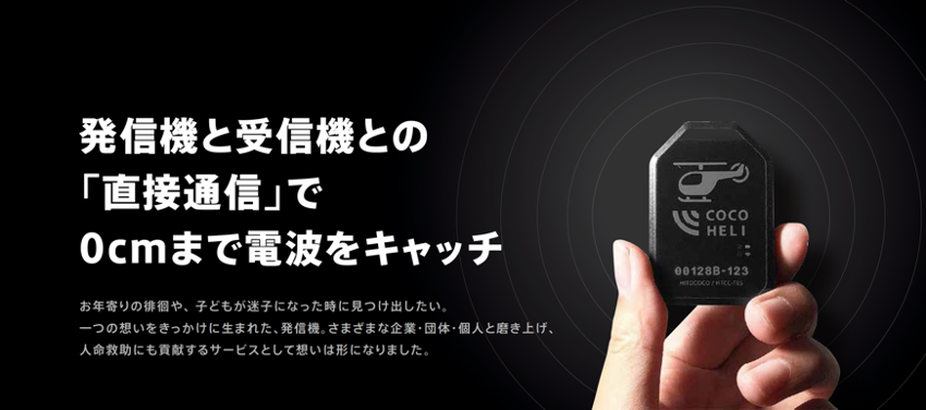 ココヘリは、17万人が利用する山岳遭難捜索サービスです。ユーザーは専用の電波を発信する発信機を持つことで、山岳遭難時に発信機と受信機の「直接通信」を用いて位置を特定され、捜索時間を大幅に短縮できます。